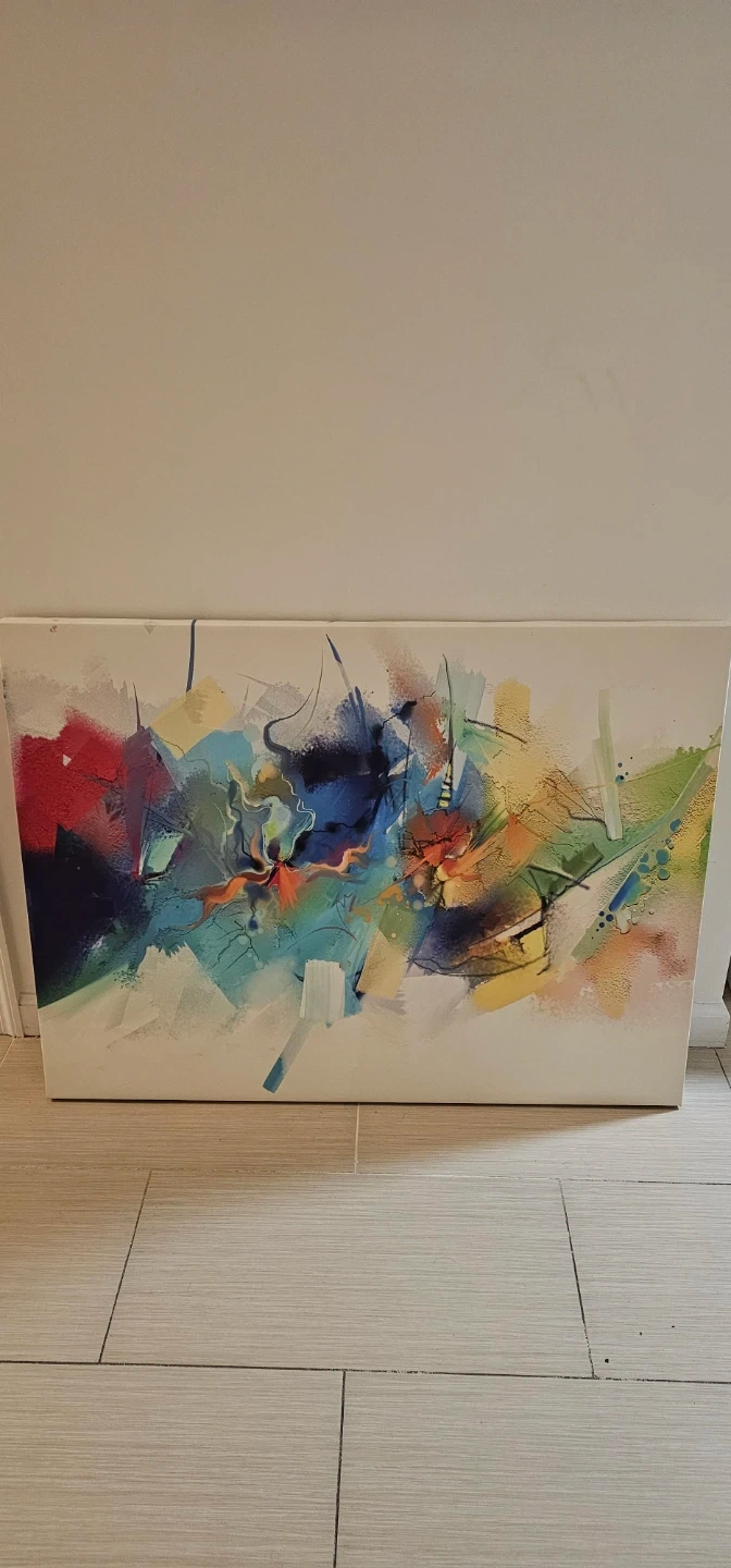 This is a vibrant abstract painting on canvas. It features a dynamic blend of blues, reds, yellows, and greens. The artwork is ready to hang and would add a modern touch to any room.