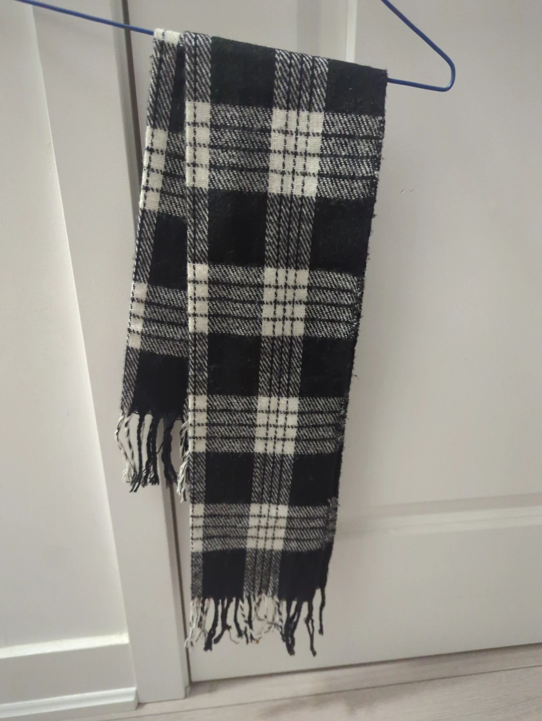 A cozy scarf featuring a classic black and white plaid pattern. It's finished with fringe on both ends. This scarf is perfect for adding a touch of warmth and style to your winter outfits!