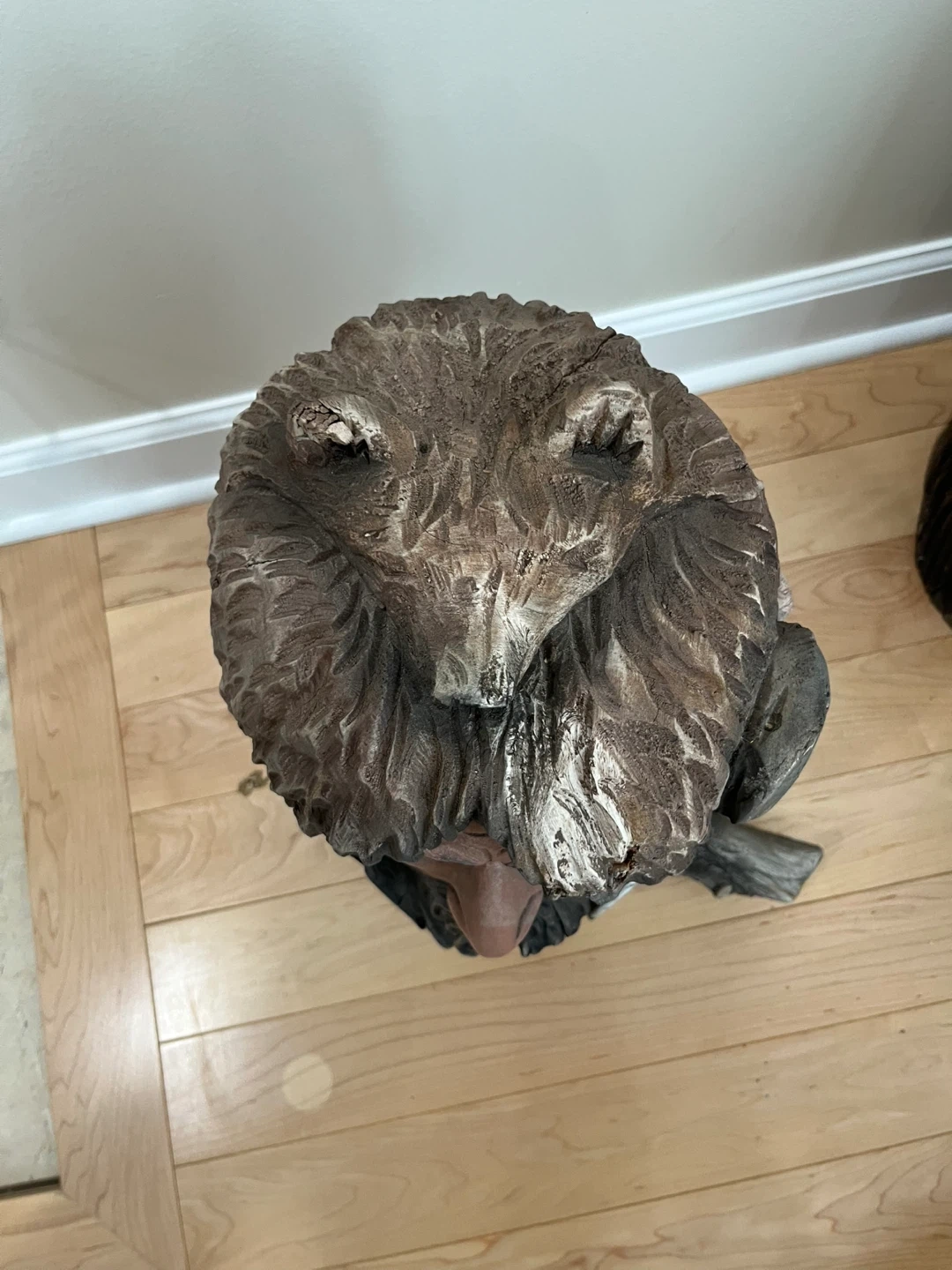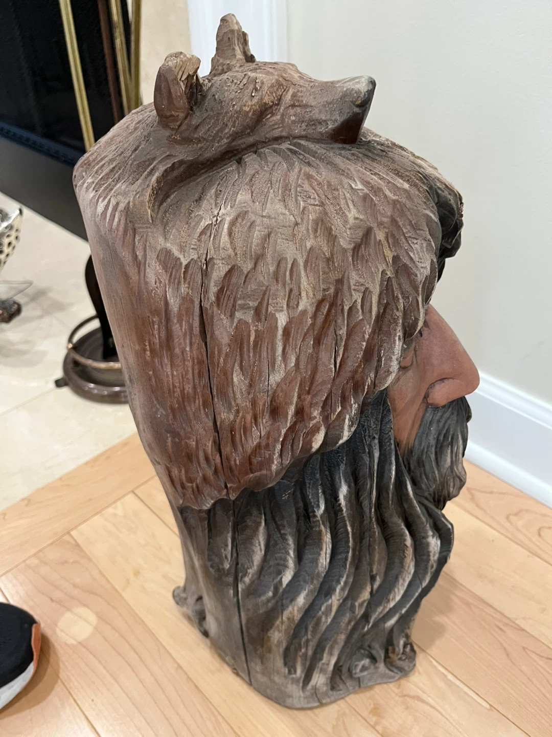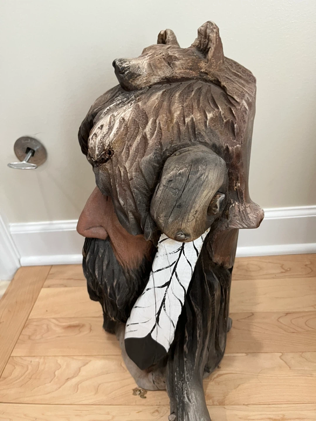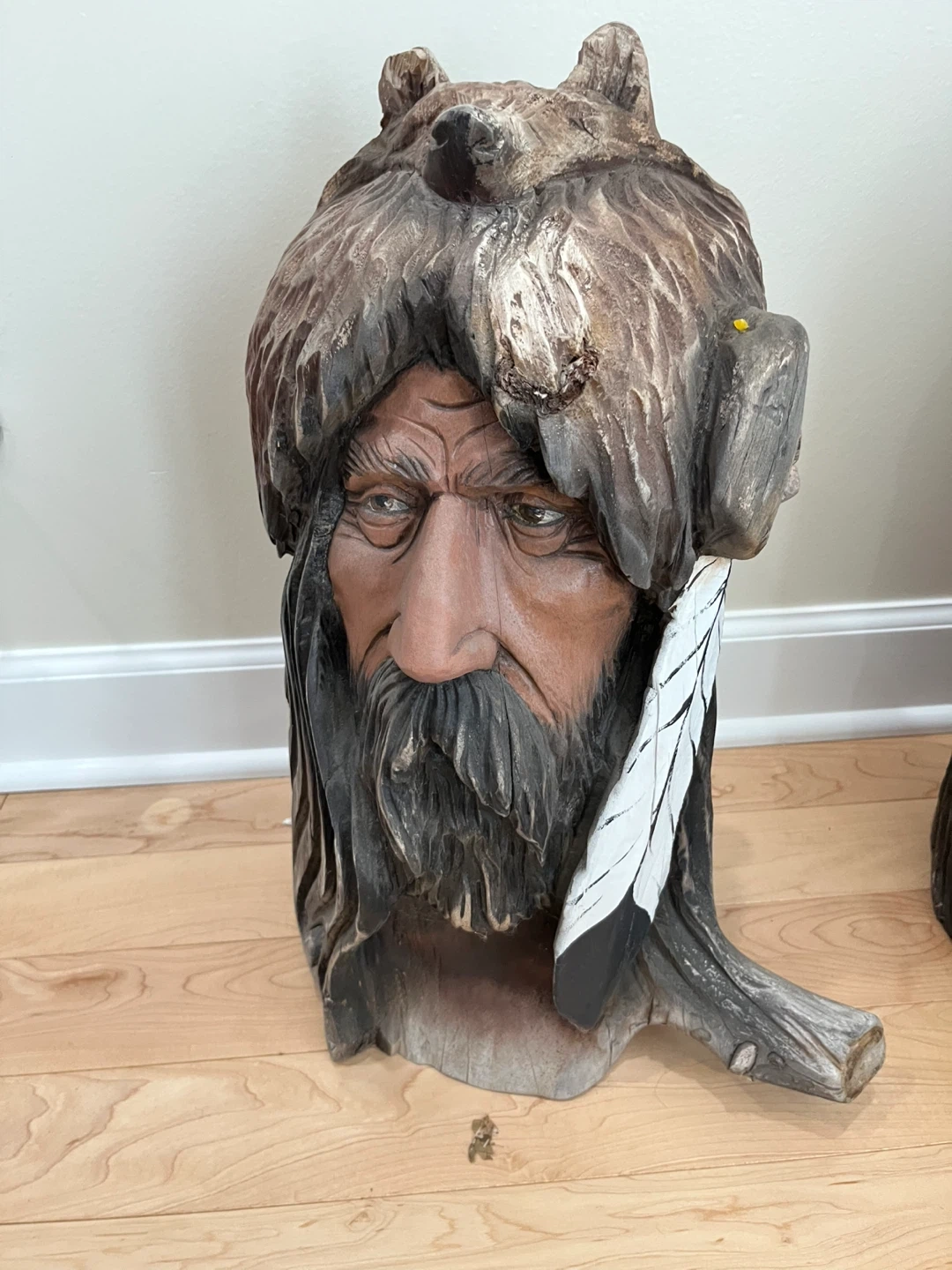 Here's a unique wood carved sculpture signed by KentBailey. It features a detailed face with a bear headdress and a feather accent. It's a great conversation piece! Original work from 1990’s from Native American Art Gallery in Evanston.