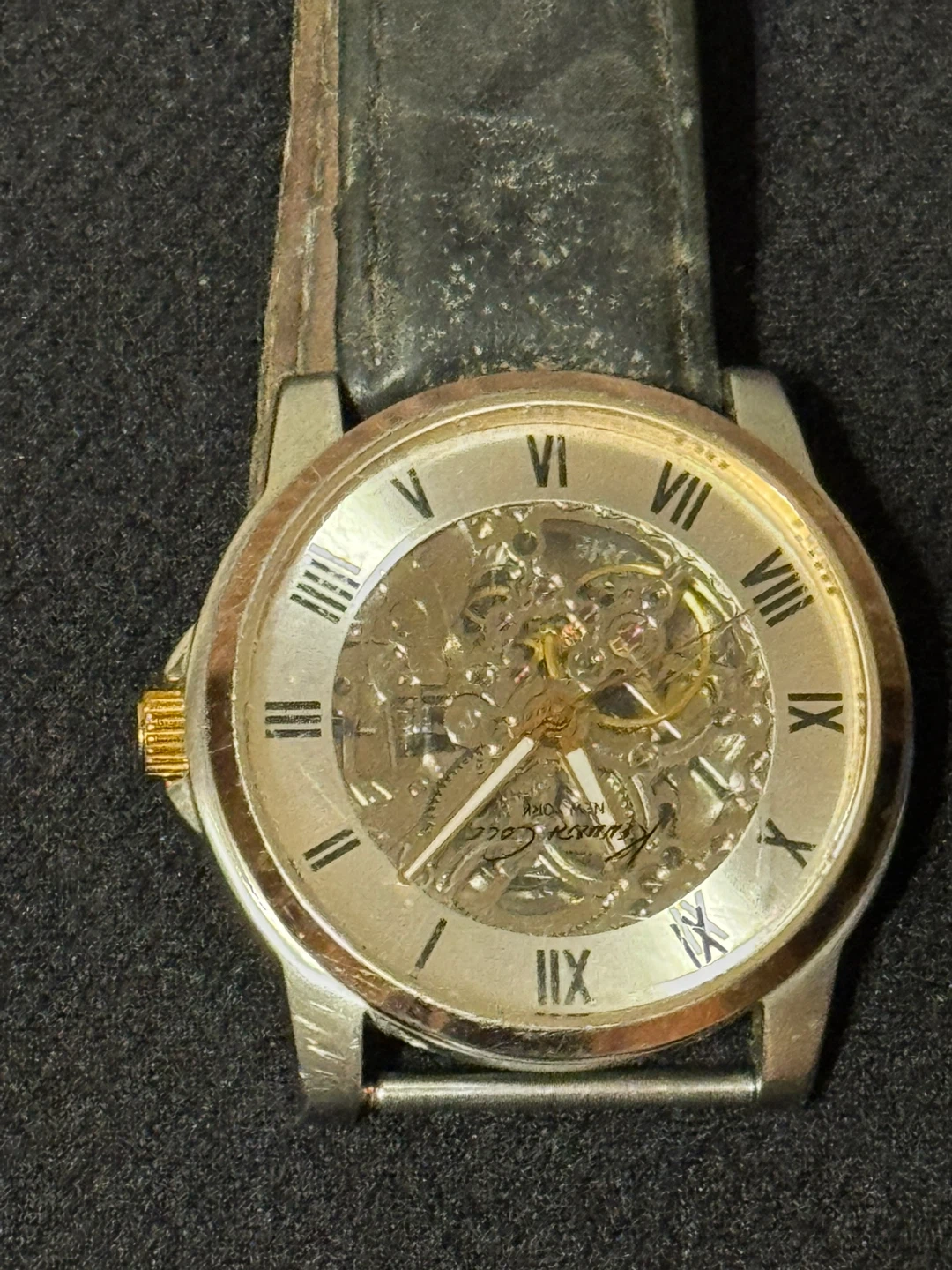 Kenneth Cole New York automatic watch, needs to take it to a repair shop . It features a unique skeleton dial that lets you see the inner workings of the watch. If you’re a craftsman this watch is for you, and the case has a silver tone. It has Roman numerals on the dial.