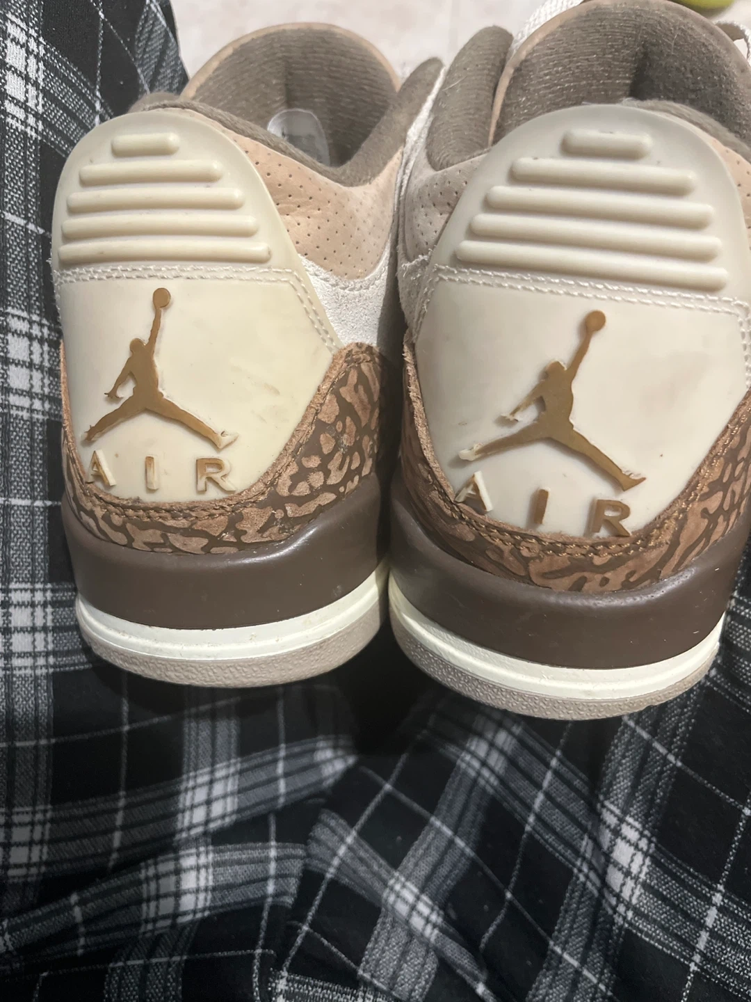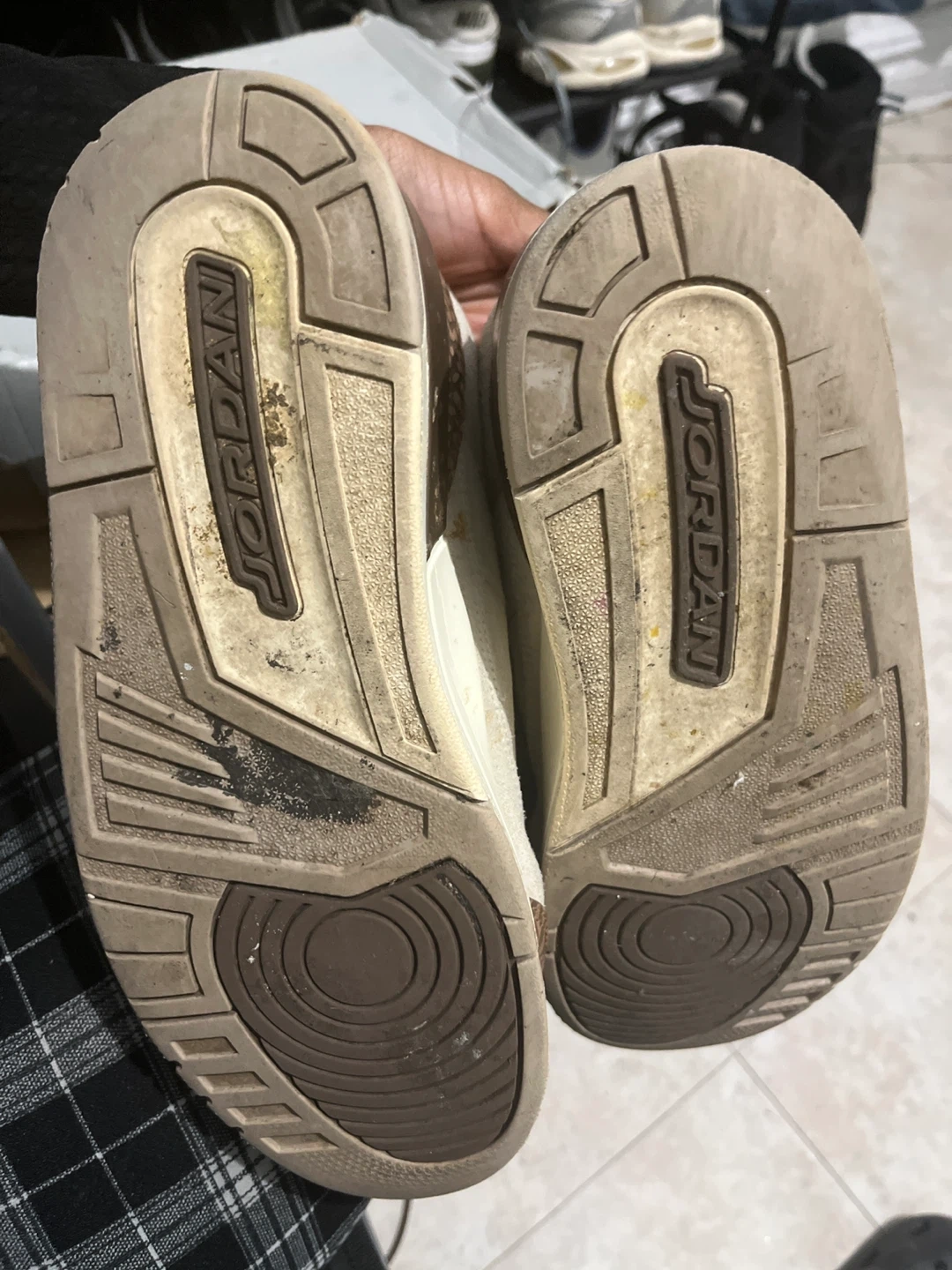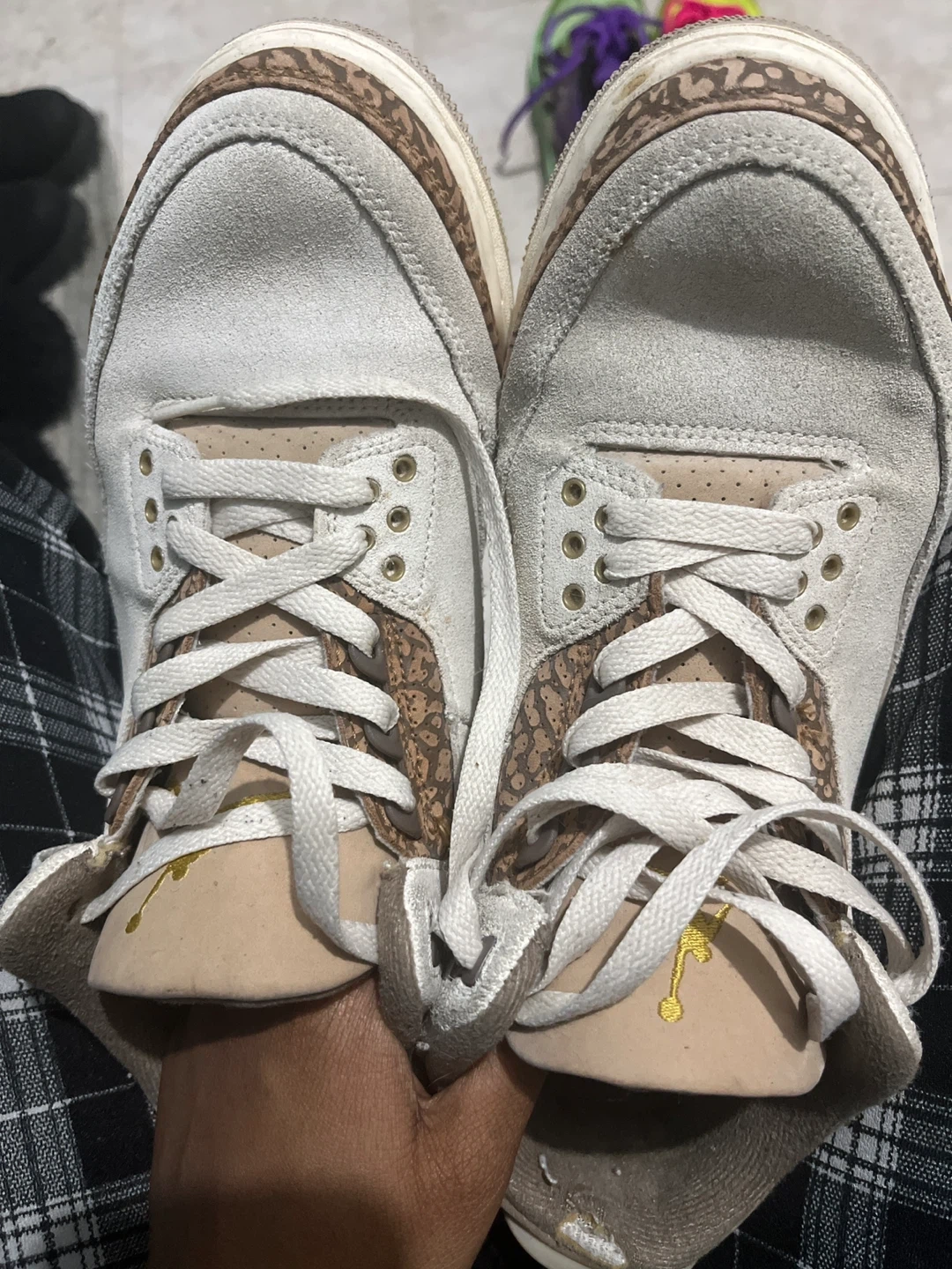 Air Jordan 3 sneakers in a tan and white colorway with animal print accents. Suede and leather upper. Rubber sole with Jordan branding. These shoes are pre-owned and show signs of wear.