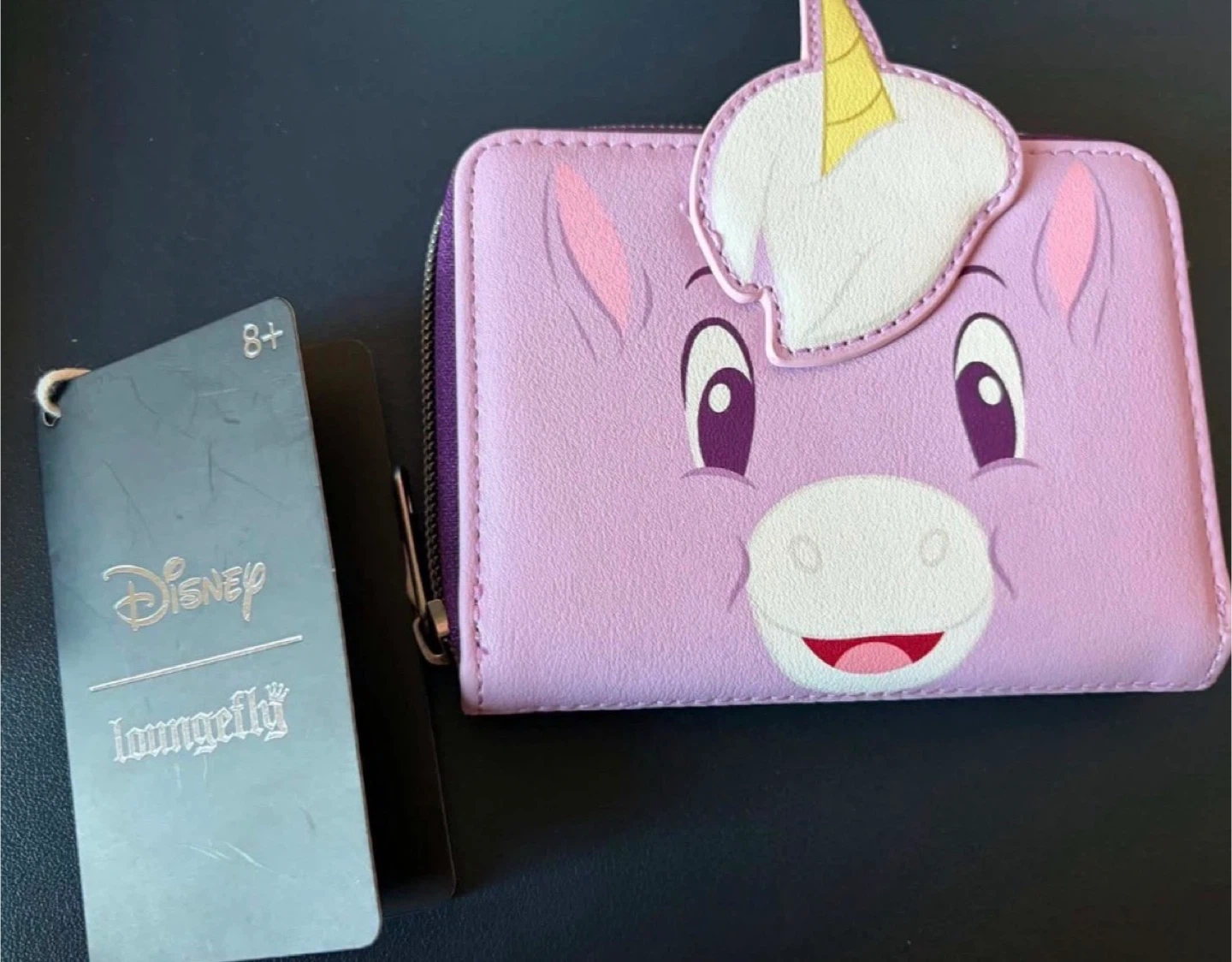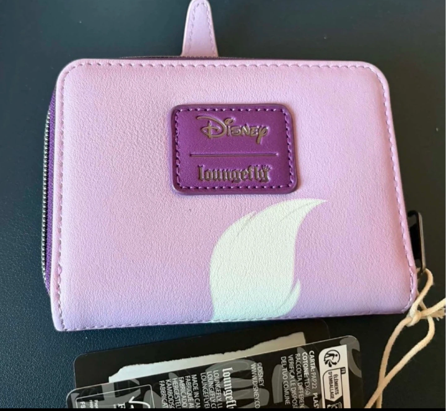 Purple bi-fold wallet with zipper closure. Features a "Disney" and "Loungefly" logo plate. It's a fun accessory for Disney fans!
