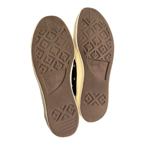 Low-top canvas sneakers in black. Rubber cap toe, lace-up closure. Logo graphic printed at outer side. Eyelets at inner side. Padded insole. Rubberized logo patch at heel. Treaded rubber sole. Contrast stitching in white. Size: Men's 10, Women's 12. Condition: Good, pre-owned. Minor wear on rubber soles and inner lining but still a lot of life left. See all photos for signs of wear.