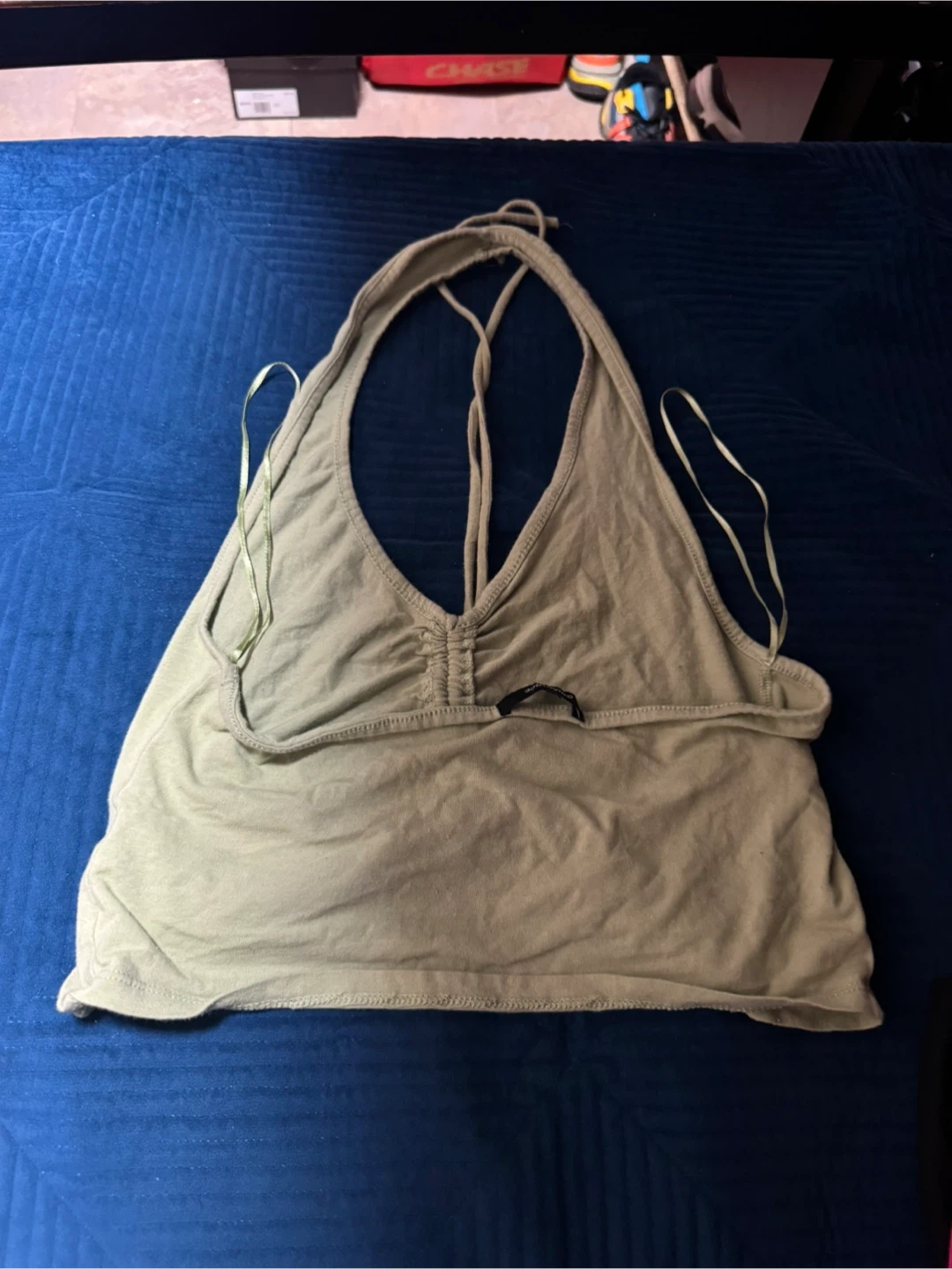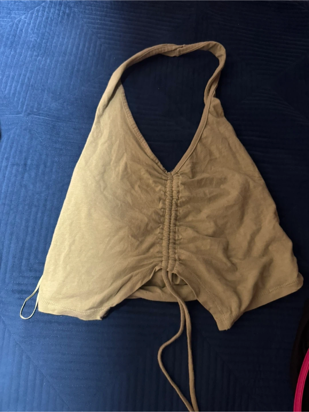 This is a cute halter top with a cinched front and adjustable tie. It's made of a soft, stretchy material. Great for warm weather or layering!