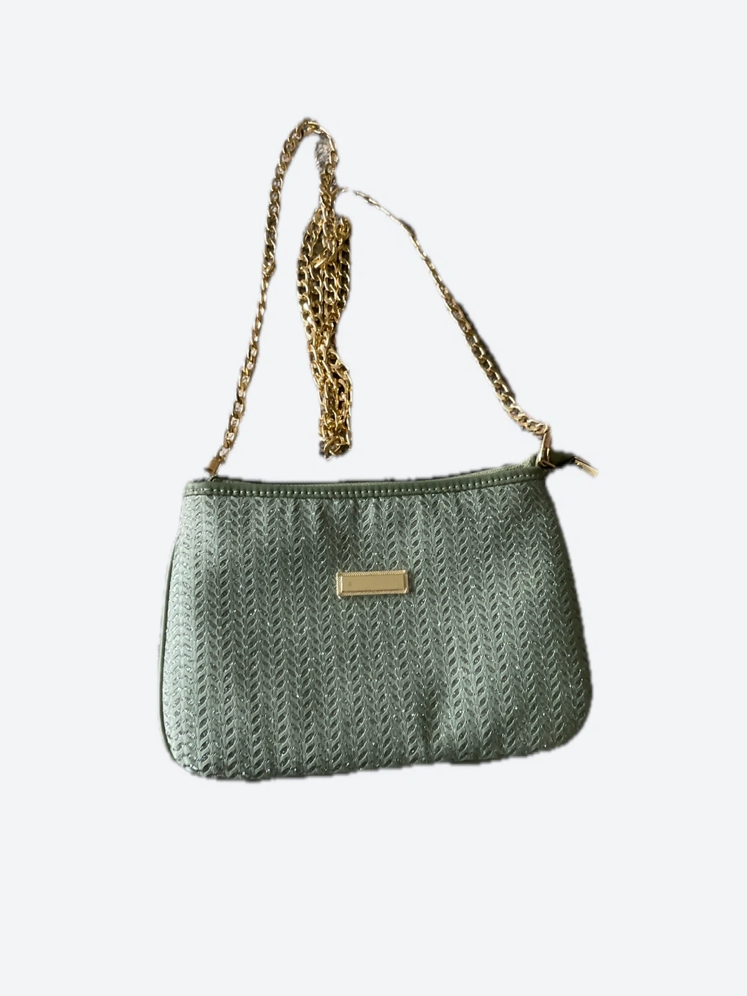 This green crossbody bag features a textured design with sparkly accents. It comes with a shiny gold chain strap. The bag has a rectangular gold-tone accent on the front.
