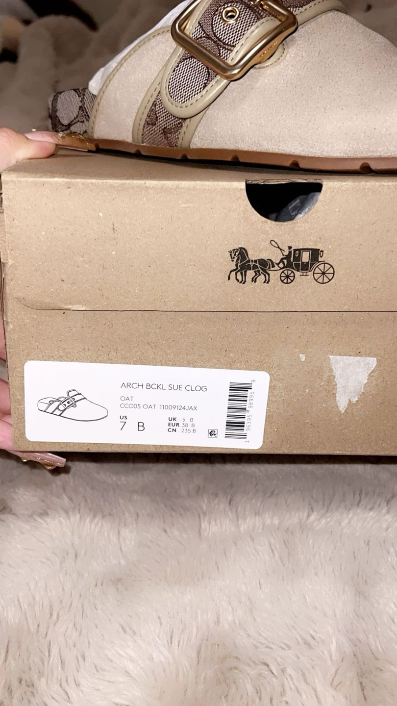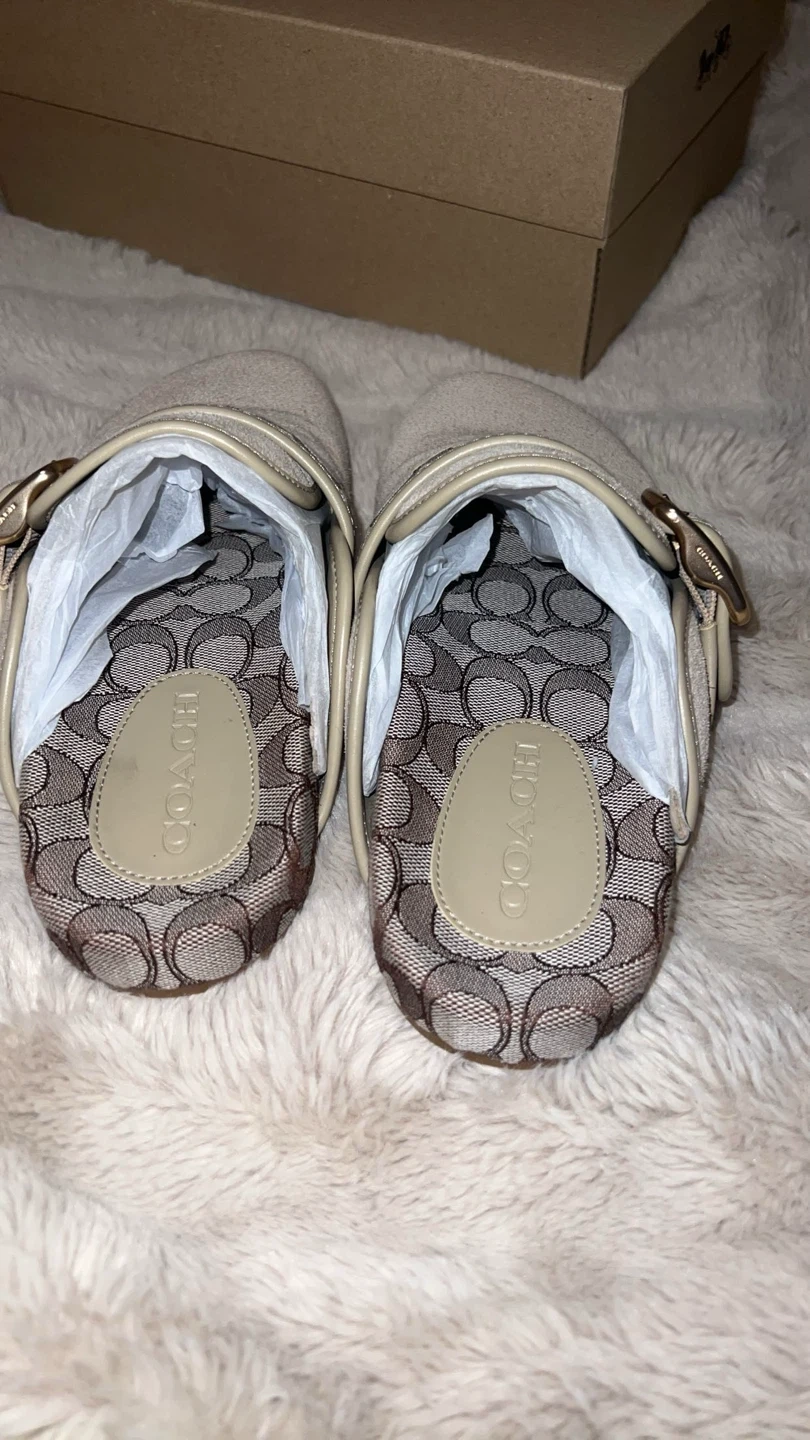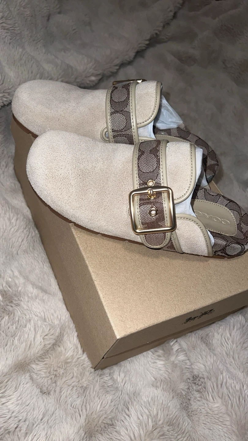 These are Coach clogs in a beige suede material. They feature the signature Coach monogram canvas strap with a buckle detail. The shoe size is a US 7 B. Includes original box. Box is a little broken, org price 200 selling for 100.