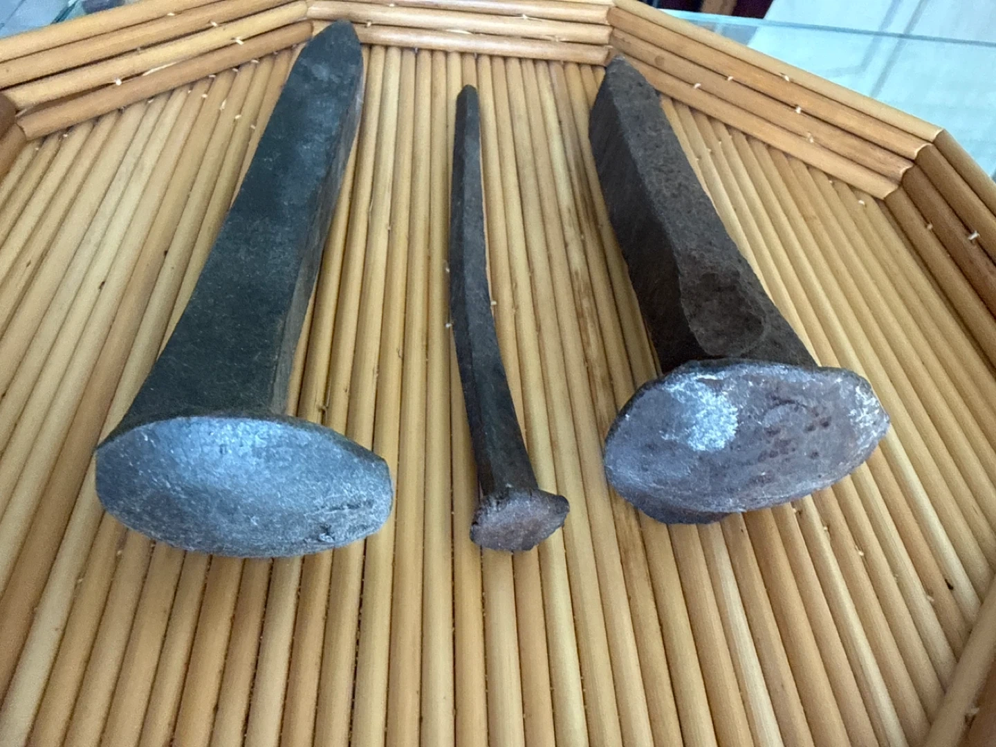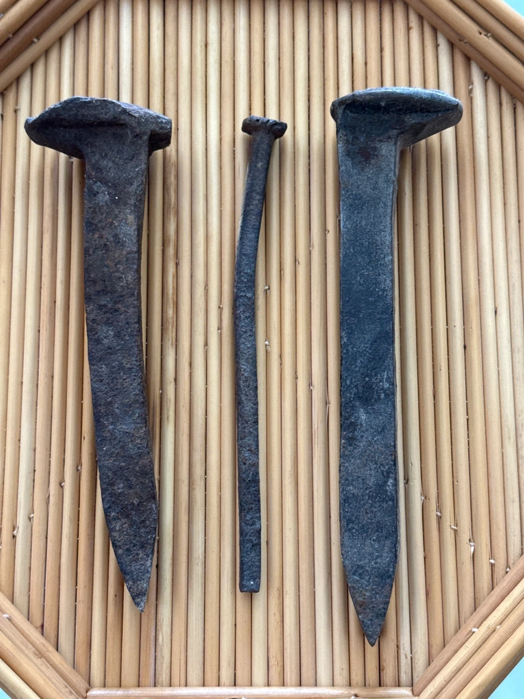 Three items: 2 antique railroad spikes, and 1 handmade nail; forged from iron. They show significant wear and patina from age and use. These large spikes would make for a unique decorative or craft item. The largest spike measures 6-1/2 inches in length, the other is 6 inches. The handmade nail is 5-3/4 inches long.