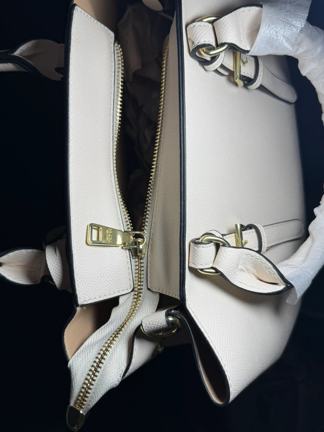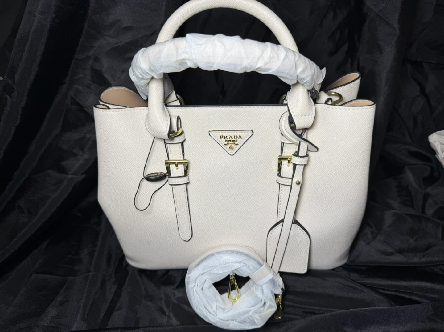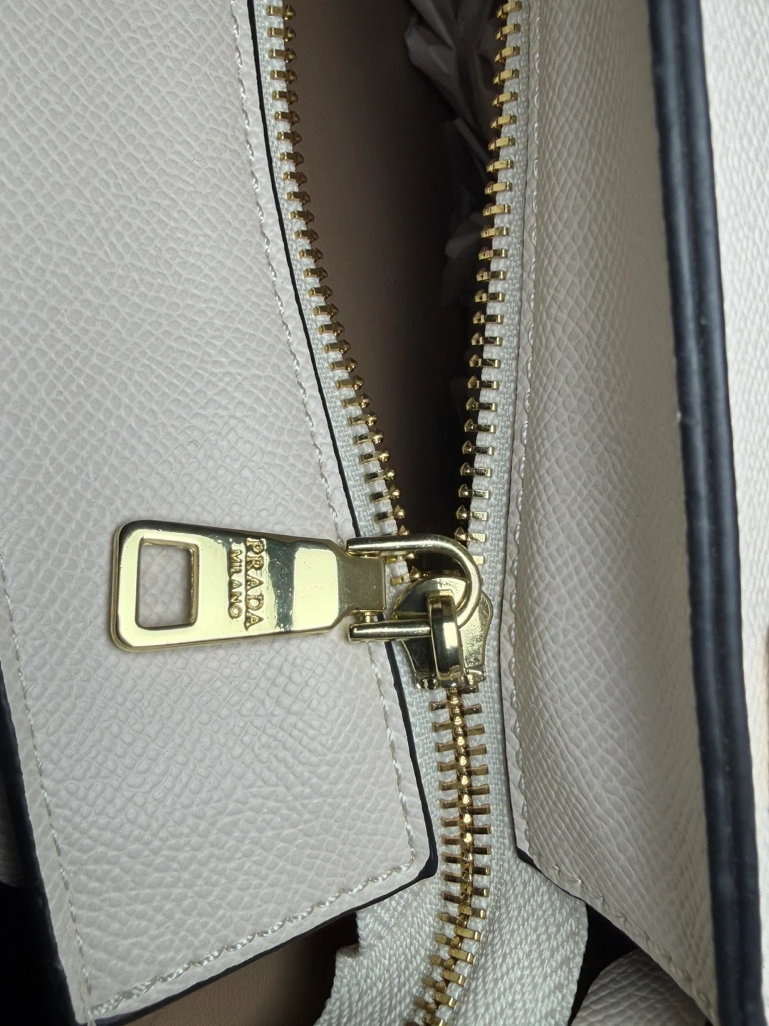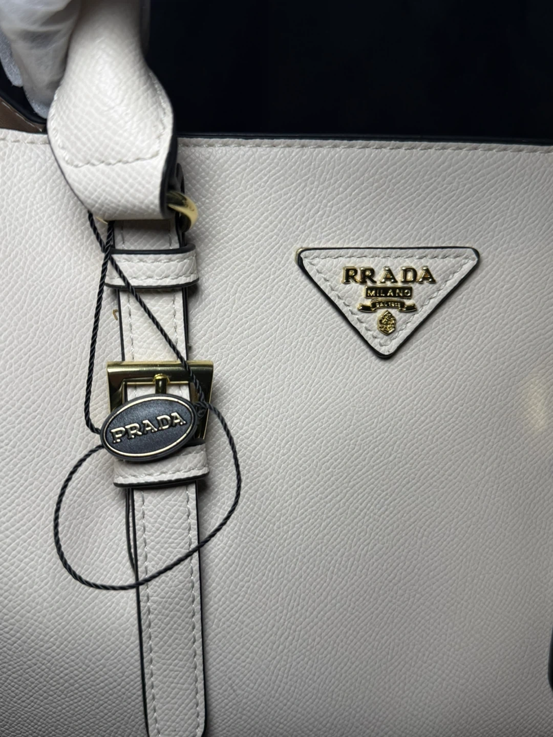 White pebbled leather tote bag from Prada. It features gold-tone hardware and a zip closure. This bag is designed with top handles and includes a detachable strap.