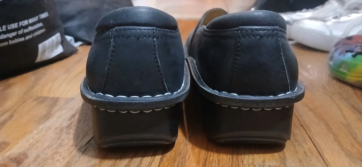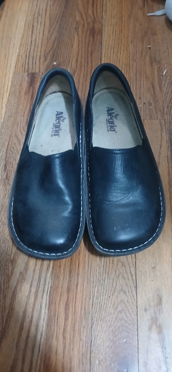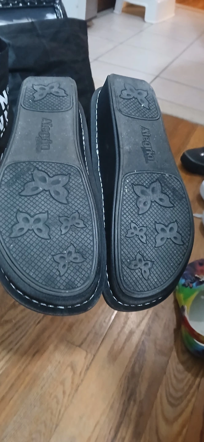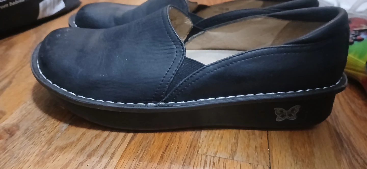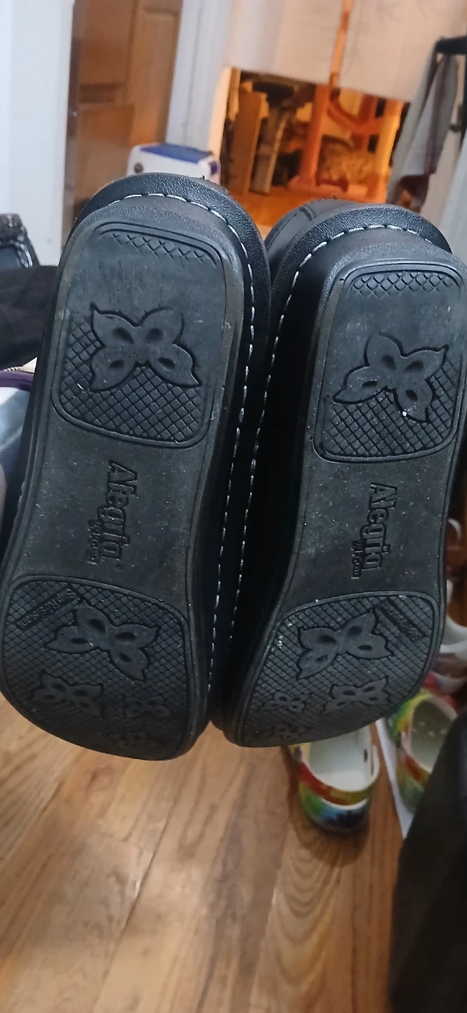 Comfortable Alegria slip-on shoes in black leather. Features a cushioned footbed and durable outsole with butterfly tread. Perfect for all-day wear!
