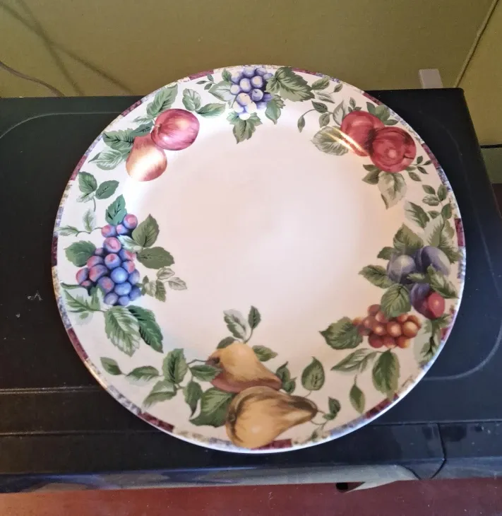 These are decorative plates featuring a colorful fruit design with grapes, plums, apples, and pears. The rim has a subtle pattern. It's perfect for adding a touch of charm to your kitchen or dining area. Adds a rustic feel to any table setting!