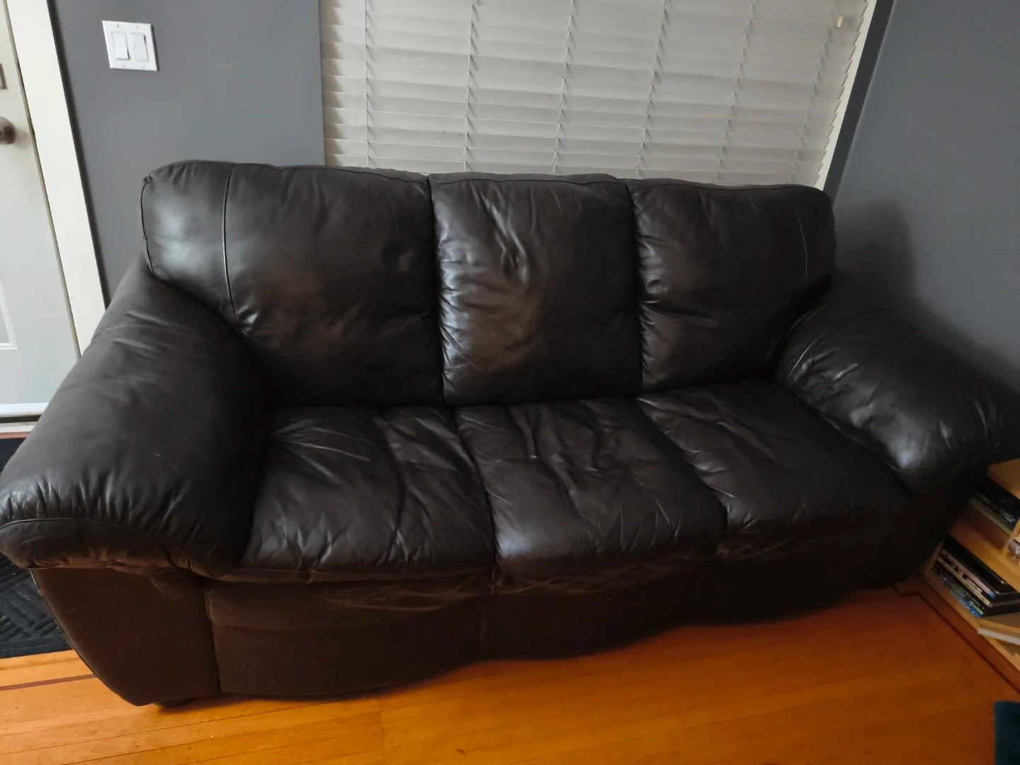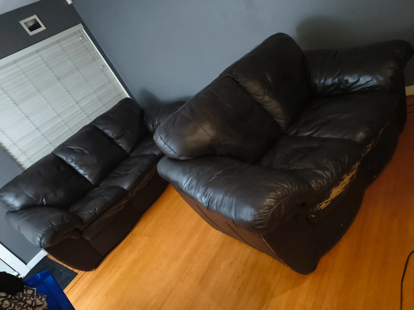 Selling a comfy black leather sofa and loveseat set. The sofa is a three-seater, and the loveseat is perfect for two. There are some signs of wear, as you can see in the photos. This is from a coffee table but they're still very comfortable and not very used. Open to selling seperately.