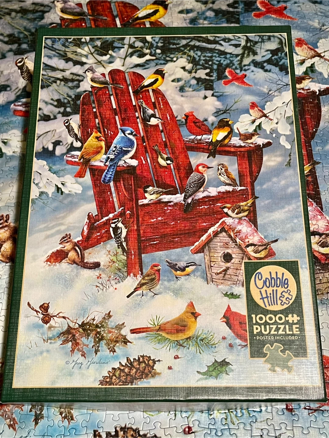 Cobble Hill 1000 piece puzzle featuring a cozy winter scene with various birds gathered around a red Adirondack chair and birdhouse. Poster is included. This puzzle is a great way to enjoy a quiet afternoon indoors! Excellent condition. No pieces missing.