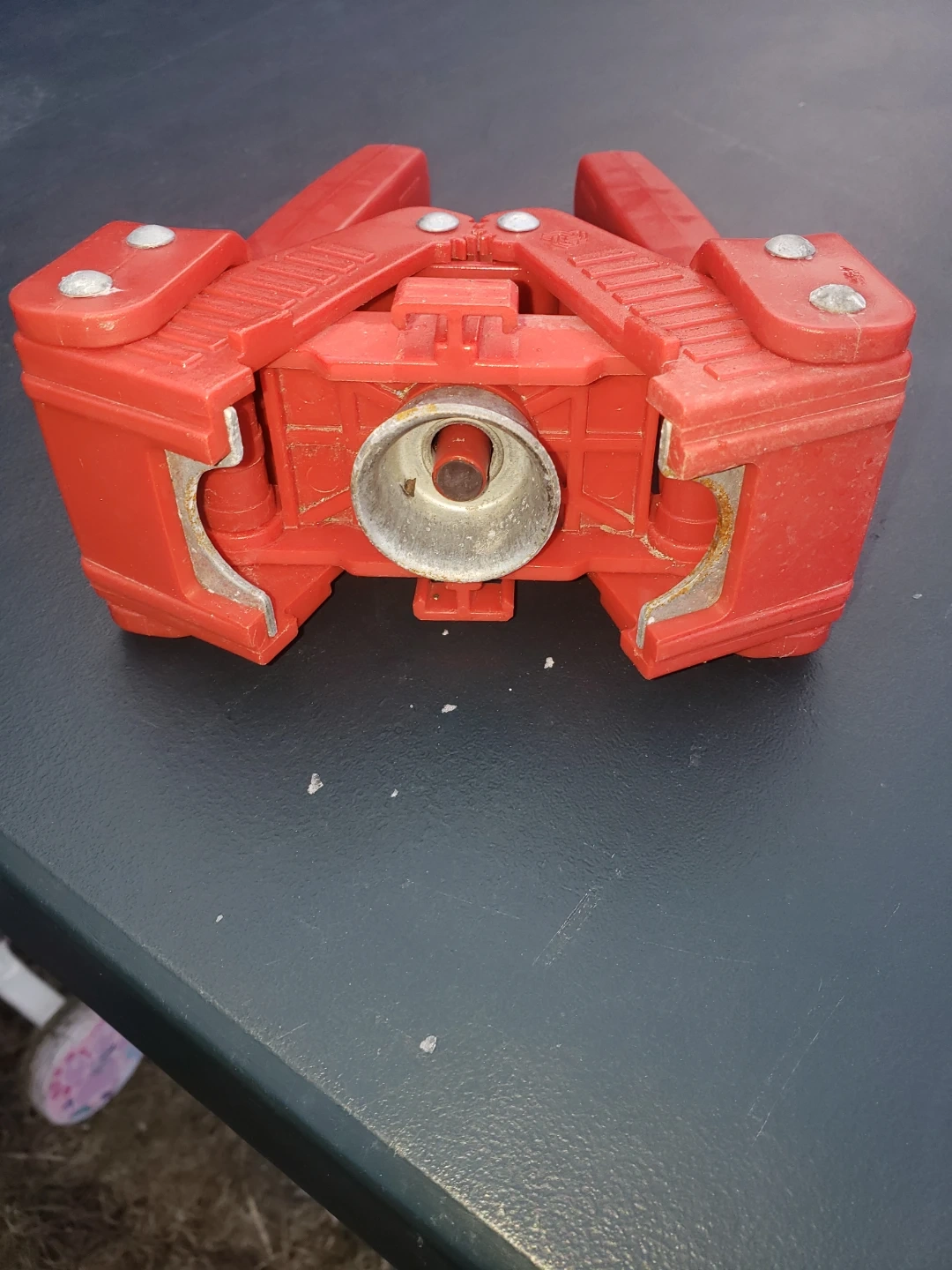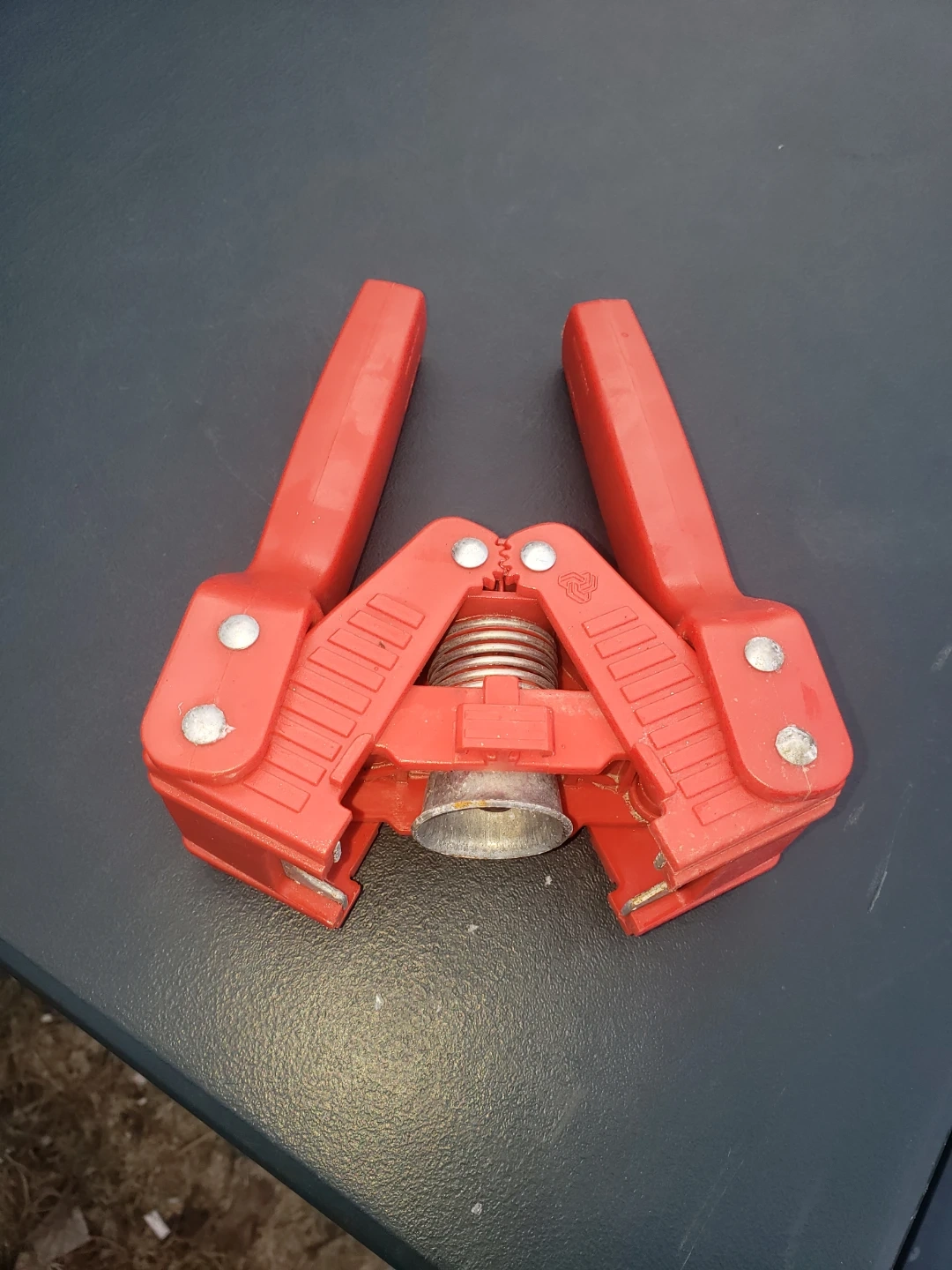 This is a red bottle capper tool. It's made of plastic with metal components. Use it to cap bottles for home brewing or food preservation.