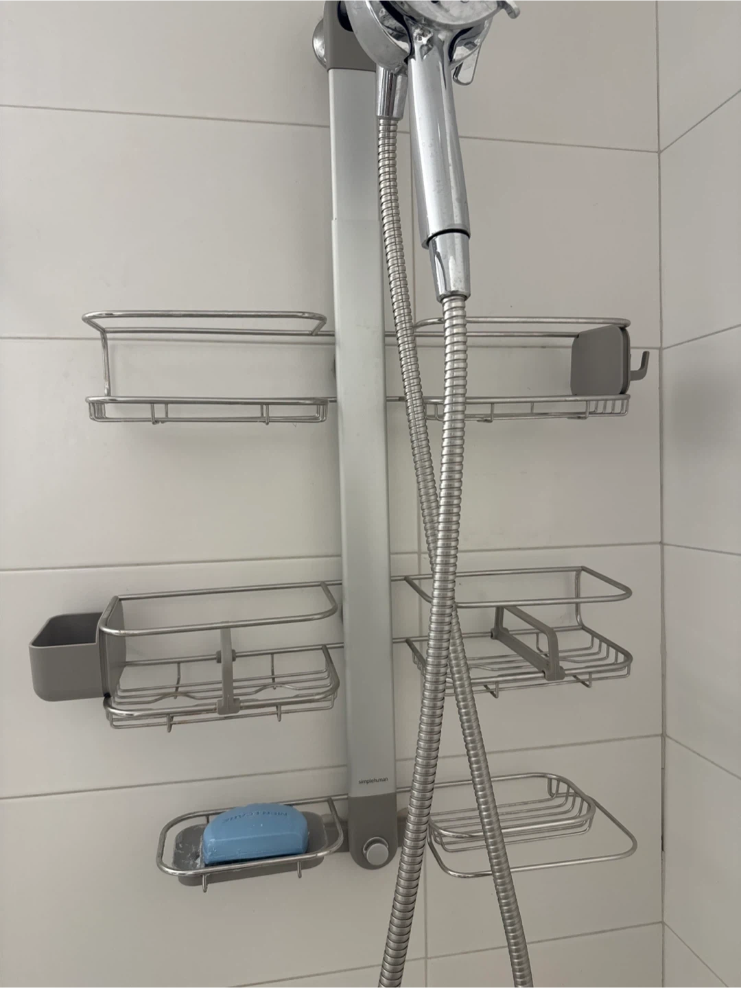 This simplehuman shower caddy is made of stainless steel and plastic. It has multiple shelves for storage and a soap dish. It attaches to your shower head or shower arm for easy access.