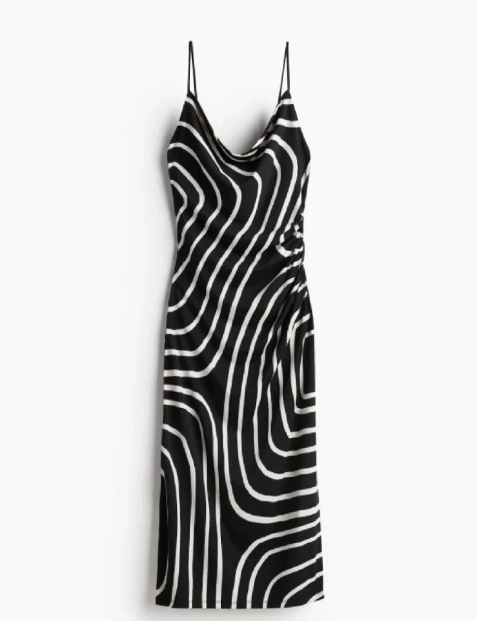 This slip dress features a black and white swirling pattern. It has a cowl neckline and adjustable spaghetti straps. The fabric has a slight sheen, making it suitable for evening wear. (Used once for 2 hours only)