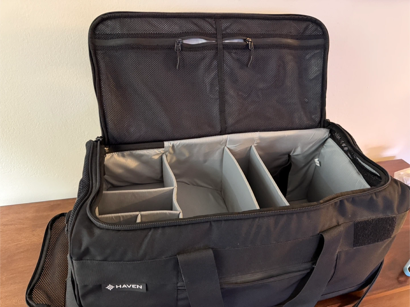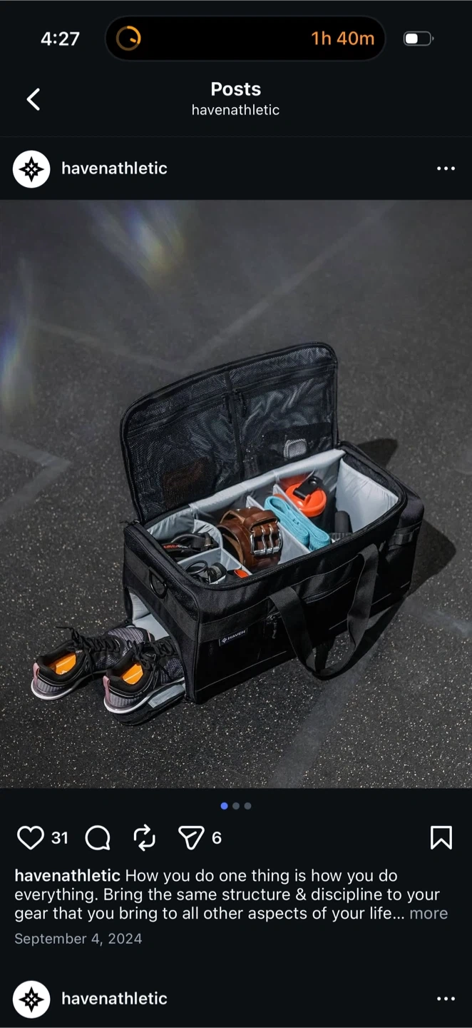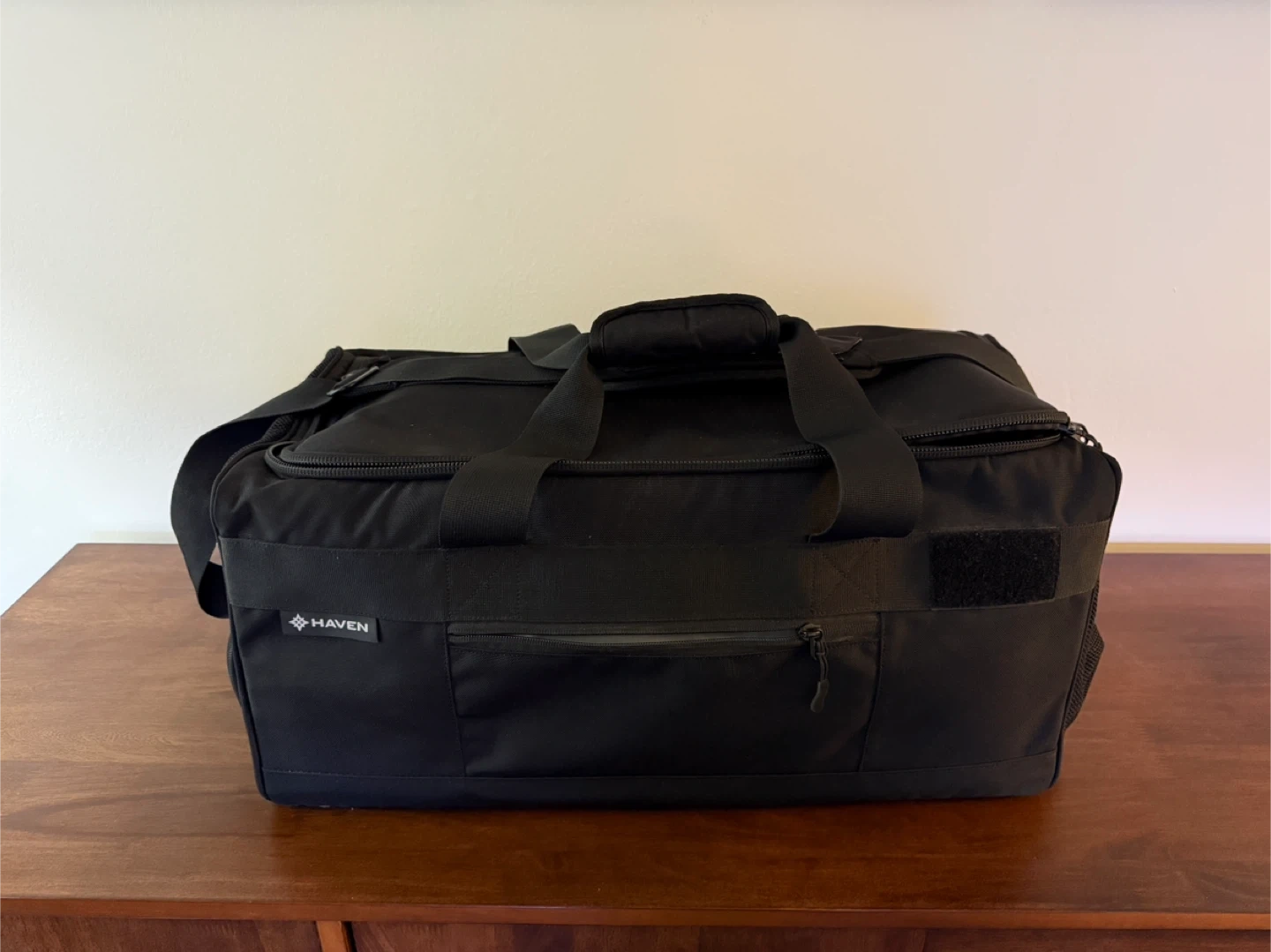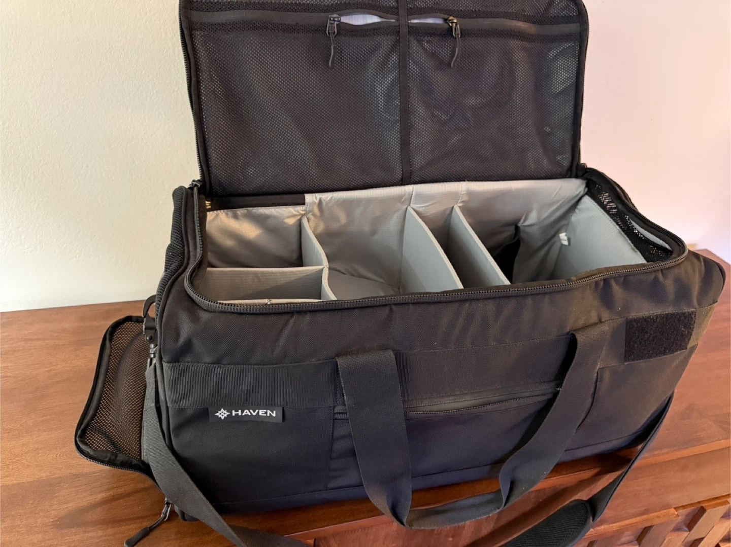 This gently used black Haven Athletic duffle bag features interior compartments for versatile storage, including a shoe garage to keep shoes separate. The bag comes with both magnetic top handles and a removable shoulder strap for easy carrying. Please refer to last picture for packed example.