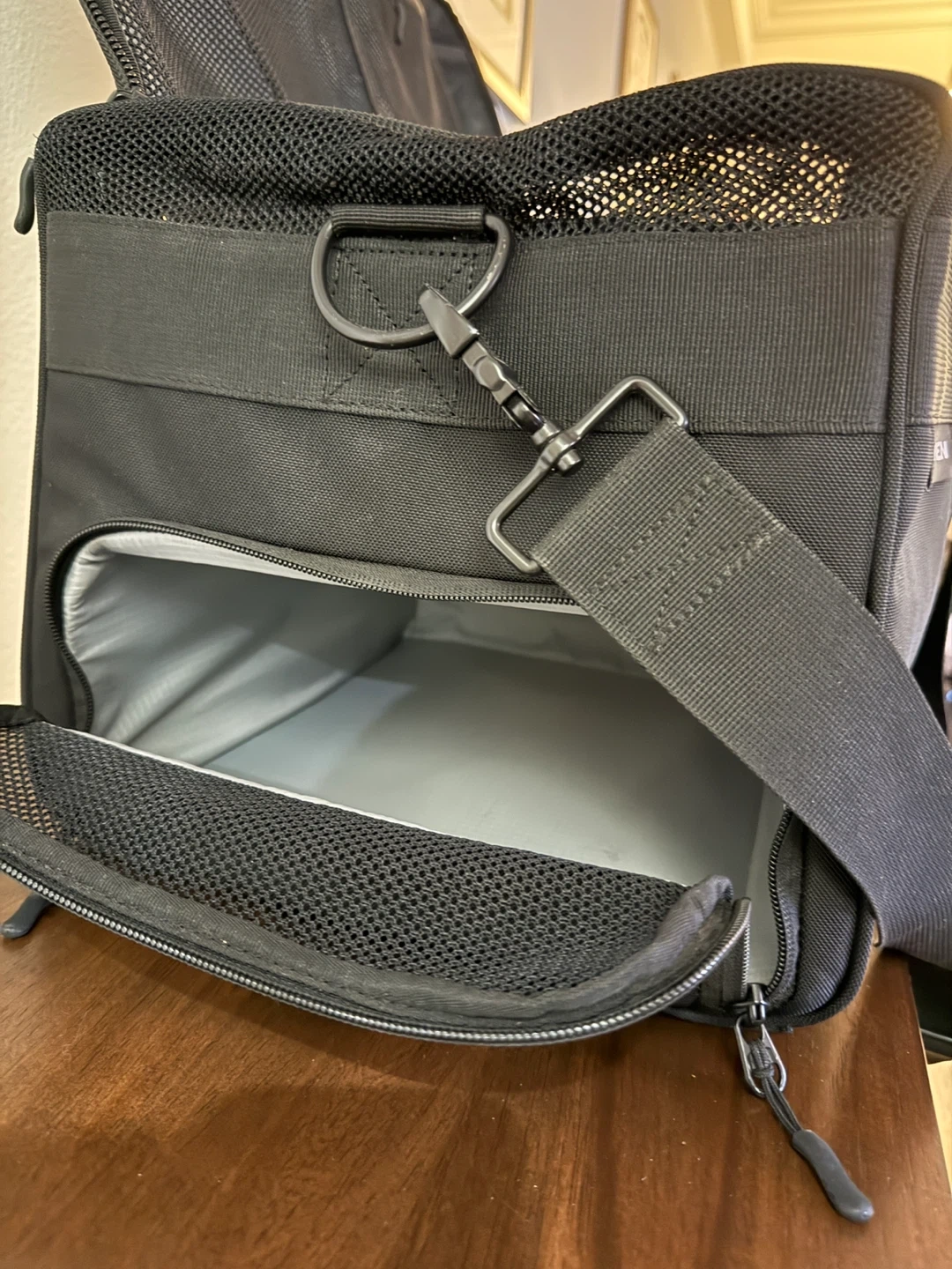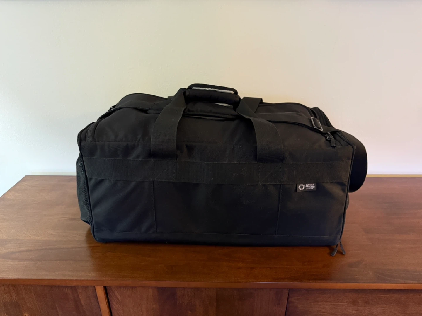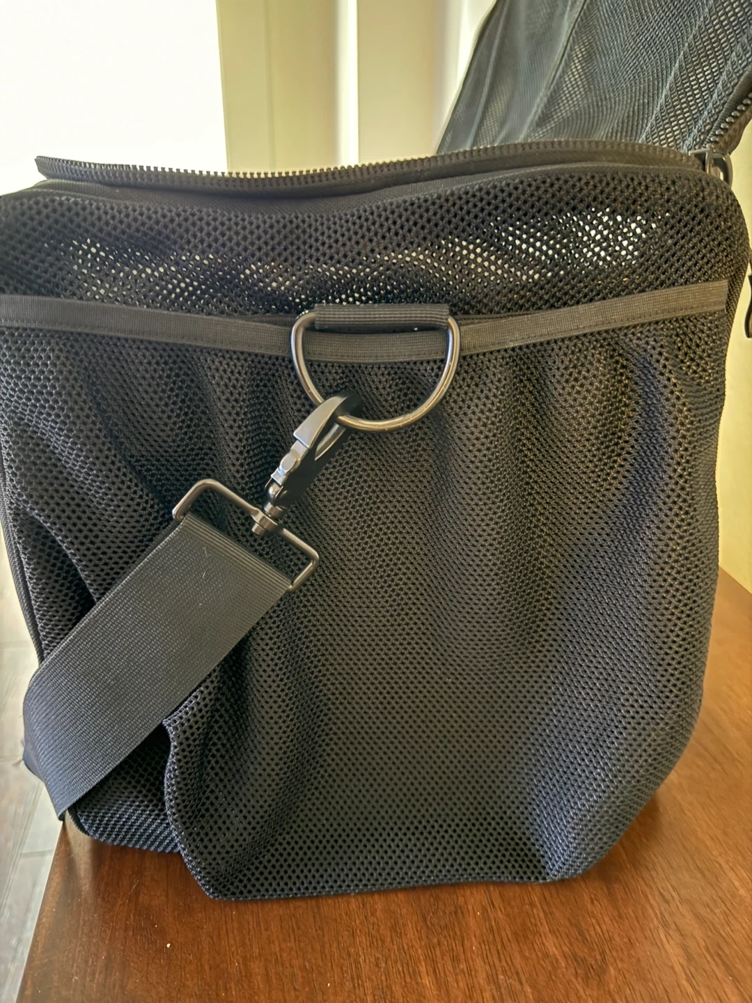This gently used black Haven Athletic duffle bag features interior compartments for versatile storage, including a shoe garage to keep shoes separate. The bag comes with both magnetic top handles and a removable shoulder strap for easy carrying. Please refer to last picture for packed example.