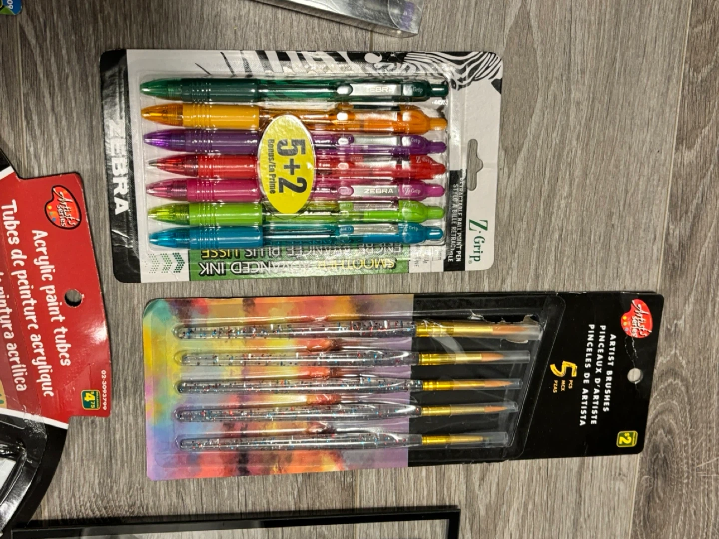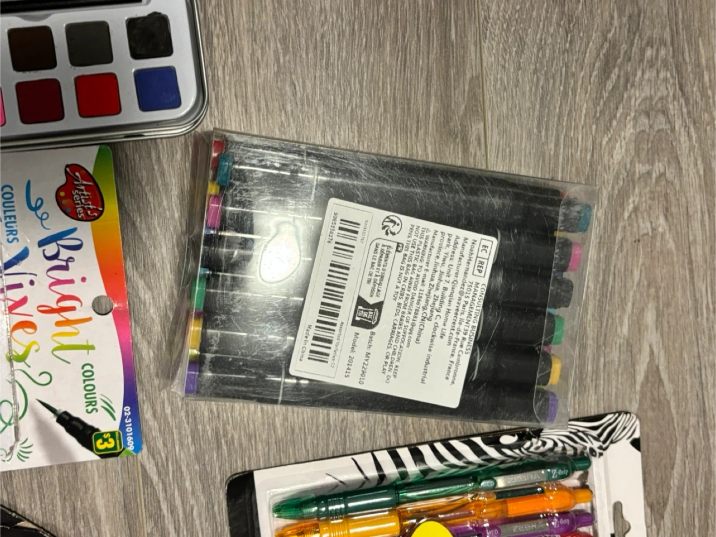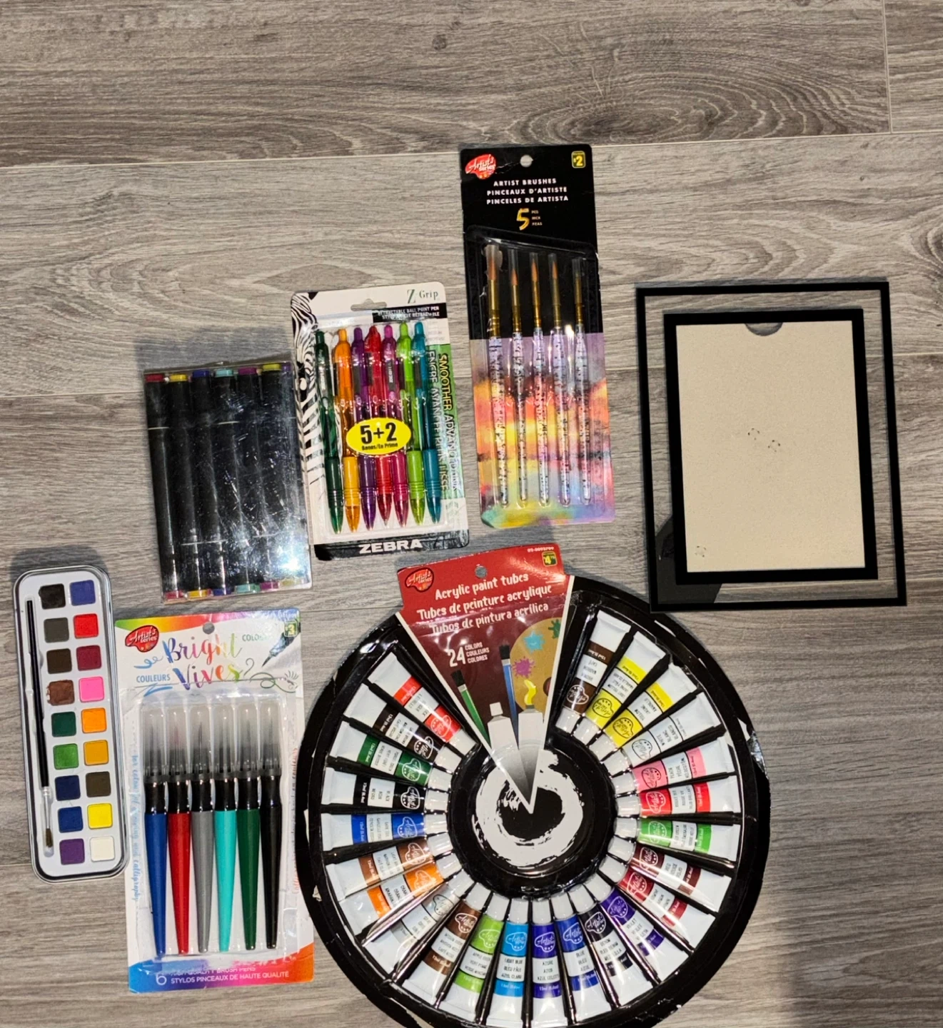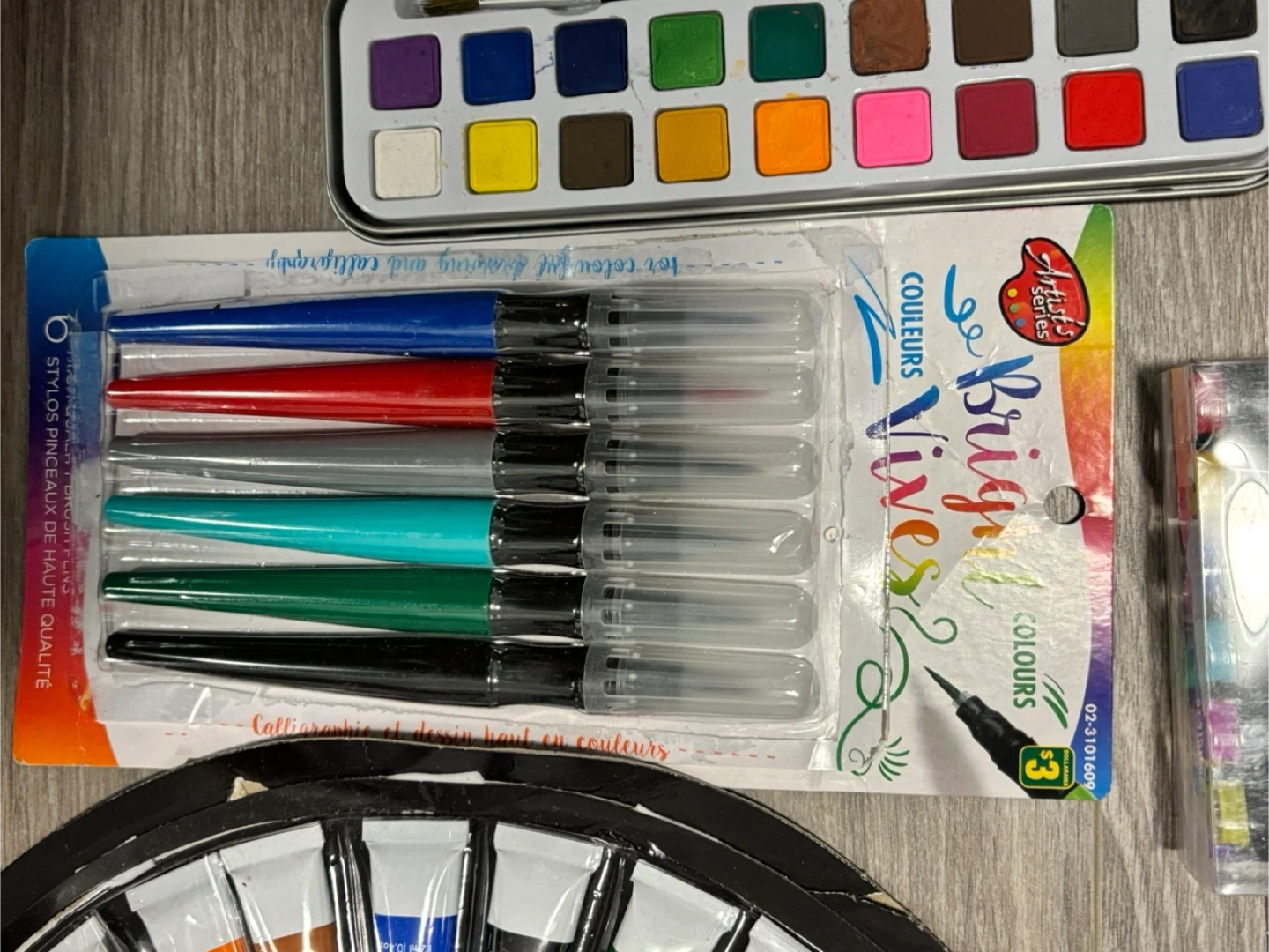 This bundle includes a set of 24 acrylic paint tubes, a watercolour paint tin with a brush, and watercolour brushes. The acrylic paints are 12ml each.
