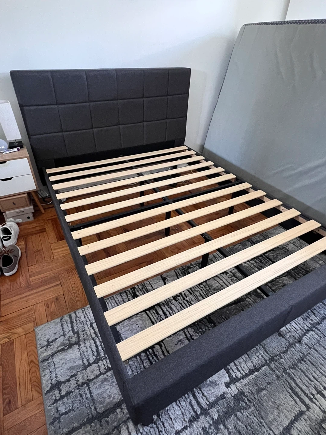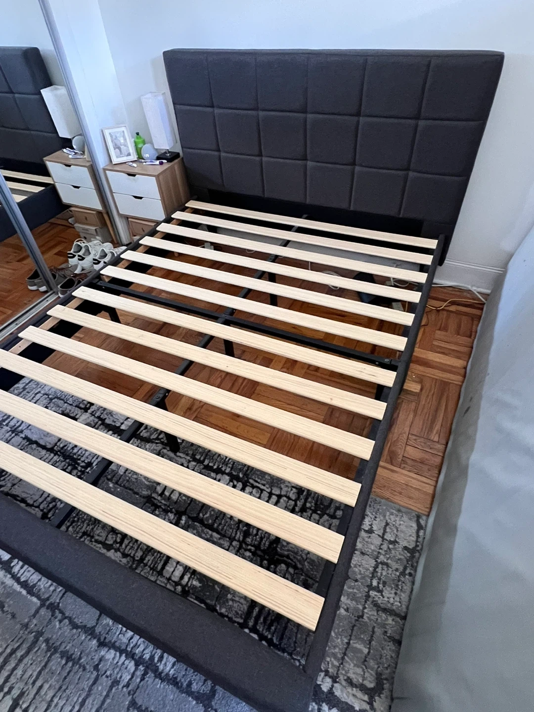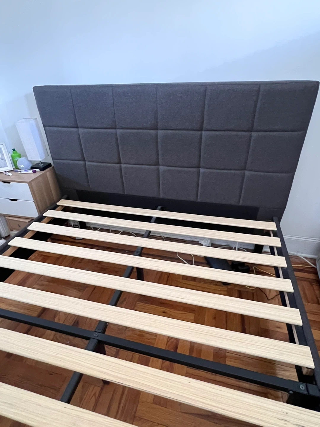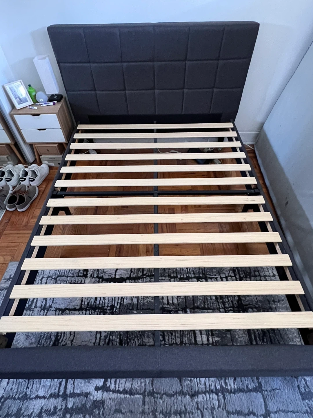In excellent condition—clean, sturdy, and ready to use. Modern upholstered headboard with square stitching and solid wooden slats for great support (no box spring needed).