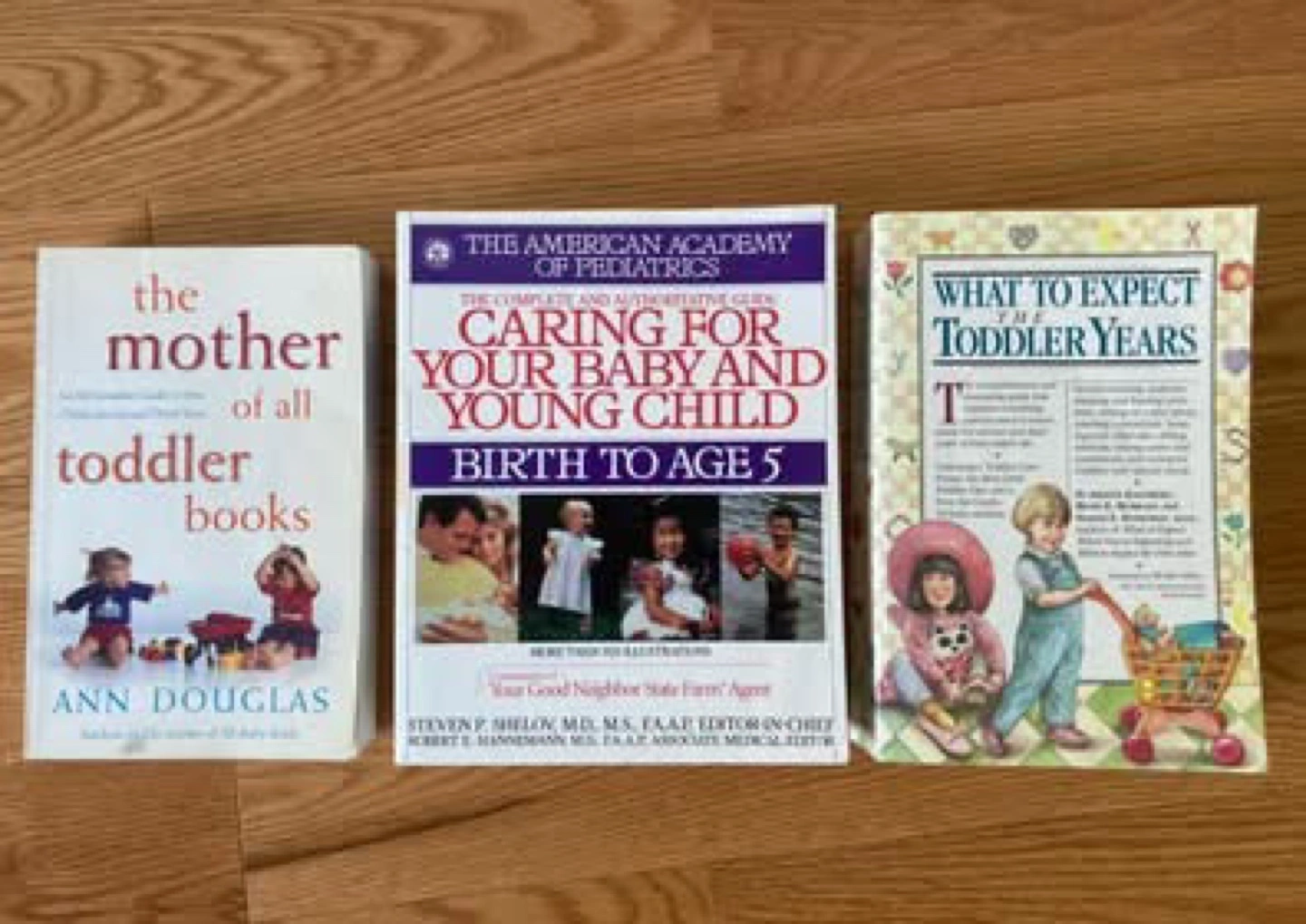 Set of three parenting books. Titles include *The Mother of All Toddler Books*, *Caring for Your Baby and Young Child (Birth to Age 5)*, and *What to Expect the Toddler Years*. Great for new and expecting parents. $7 for all three.