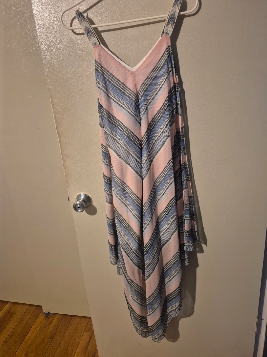 This is a pink, blue, and gray striped midi dress. It features a V-neck and spaghetti straps. Made from a lightweight fabric, it's perfect for warmer weather.