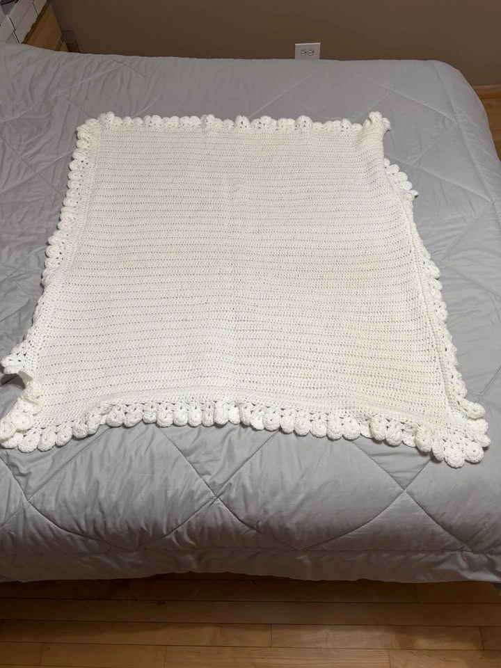 Beautiful handmade crocheted baby blanket in a classic soft white with an elegant raised scalloped border. The clean timeless design makes this a perfect keepsake blanket for a nursery, baby shower gift, christening, stroller blanket, or special photo prop.