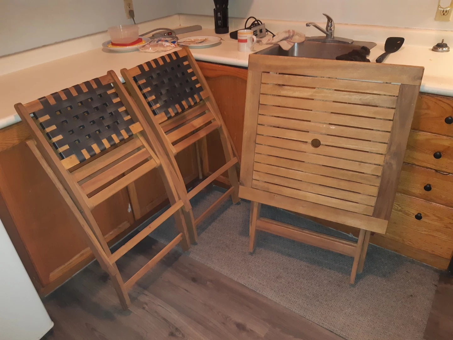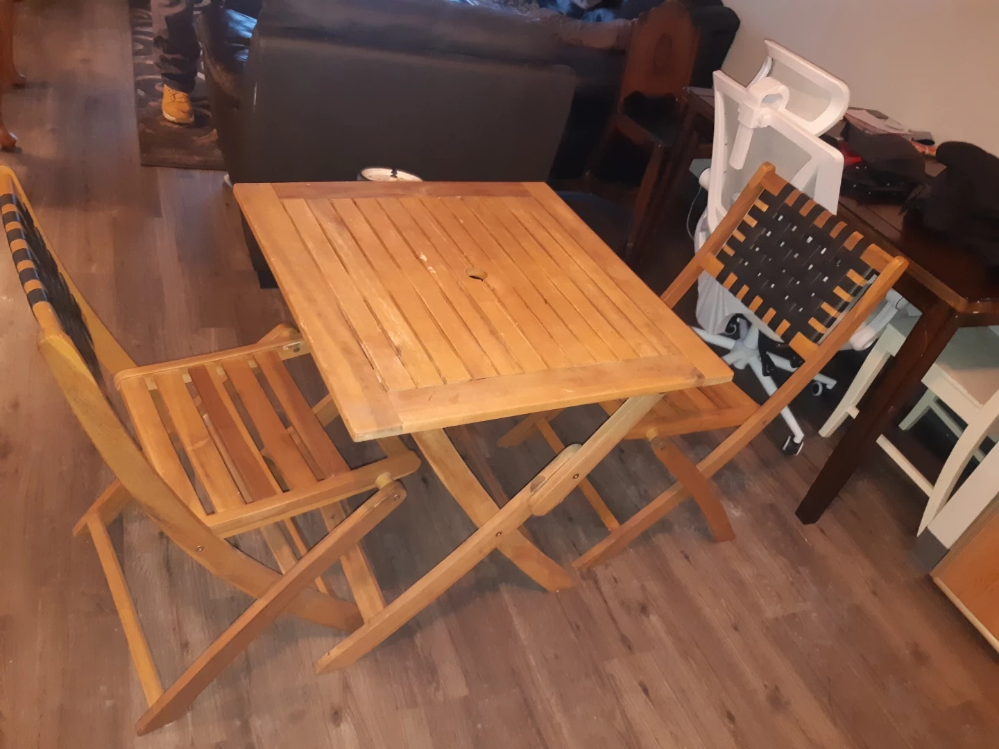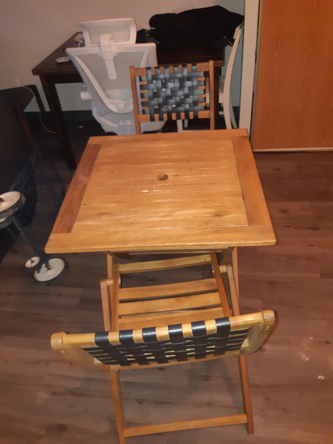 This is a set of a wooden folding table and two matching chairs. The chairs have black woven straps for the seat and back. They're great for patios or small spaces. The table is also wooden and folds for easy storage.