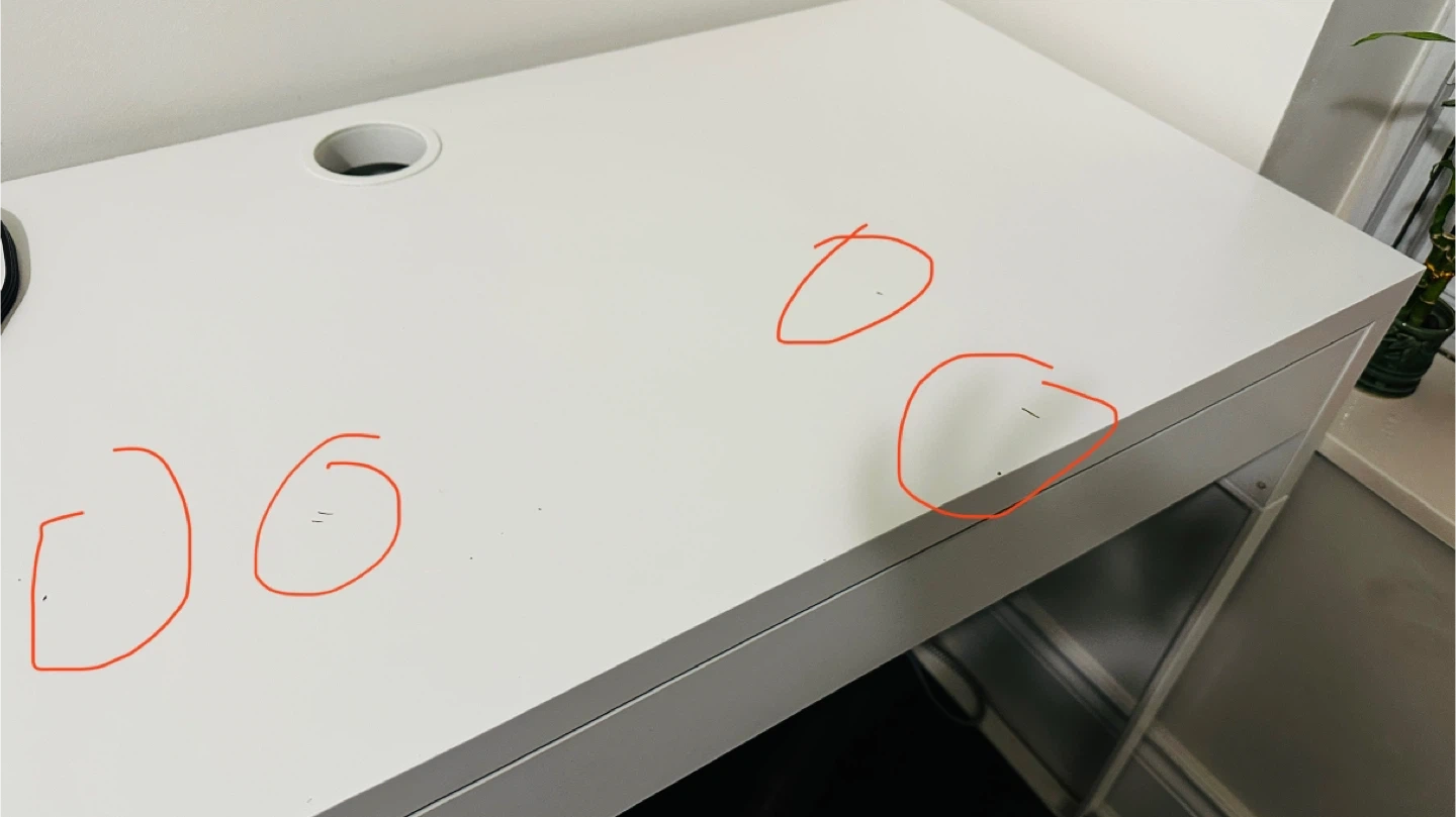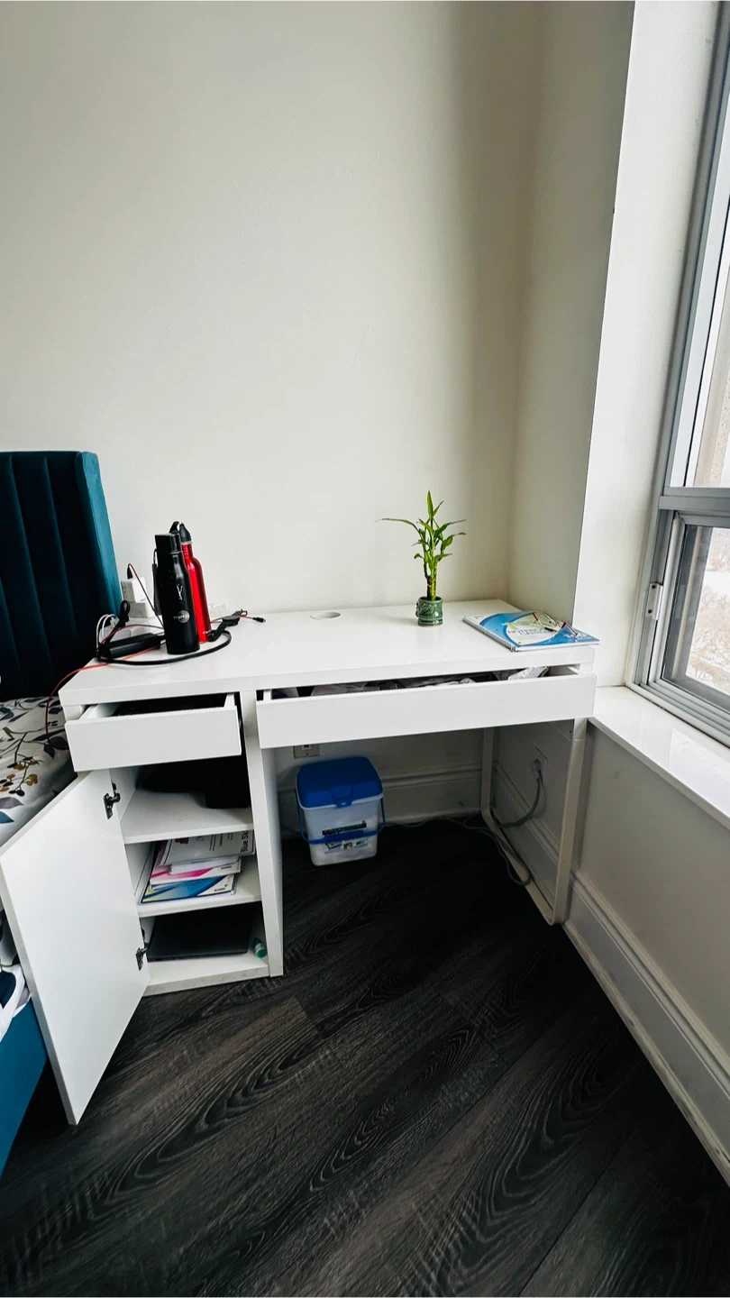 This is a white IKEA MICKE desk. It has one drawer and a cabinet with shelves. Cable management hole is included on the tabletop. This desk is 105 cm wide.