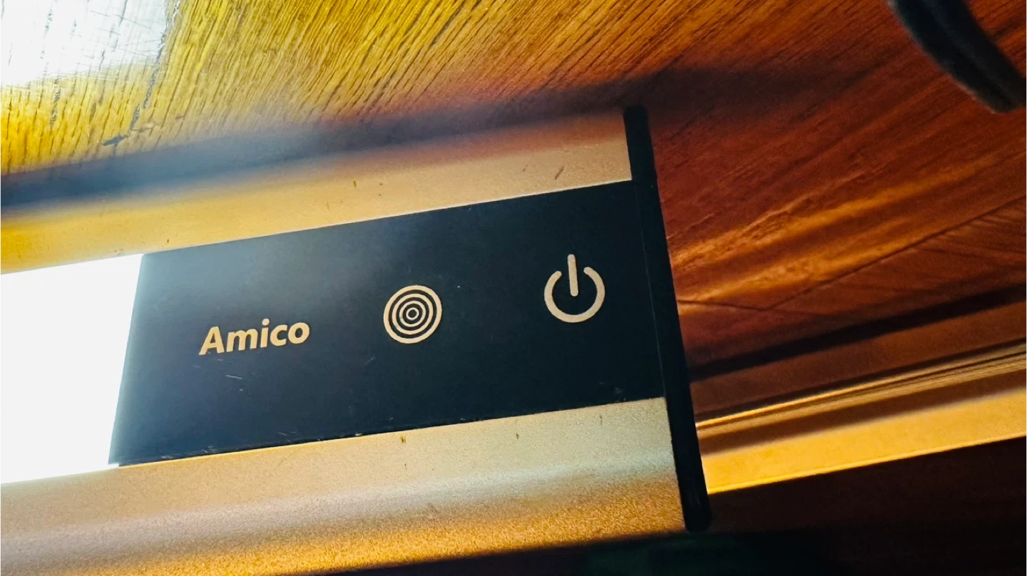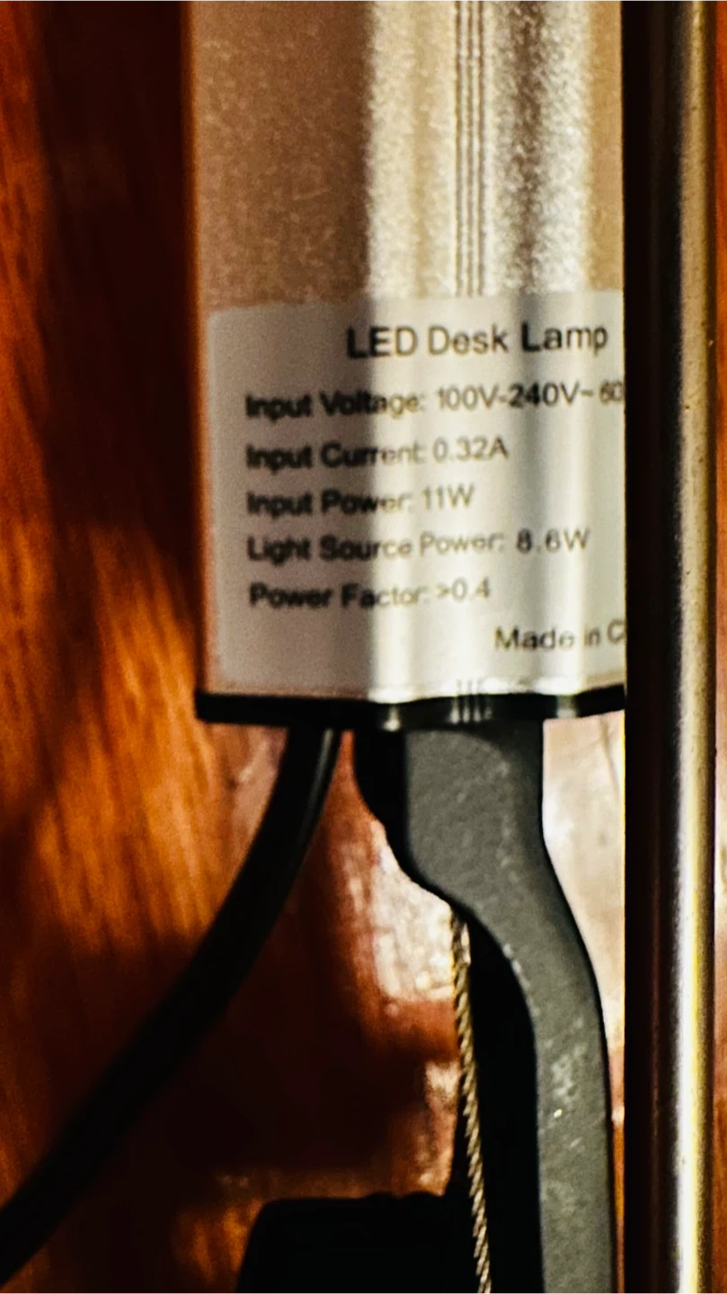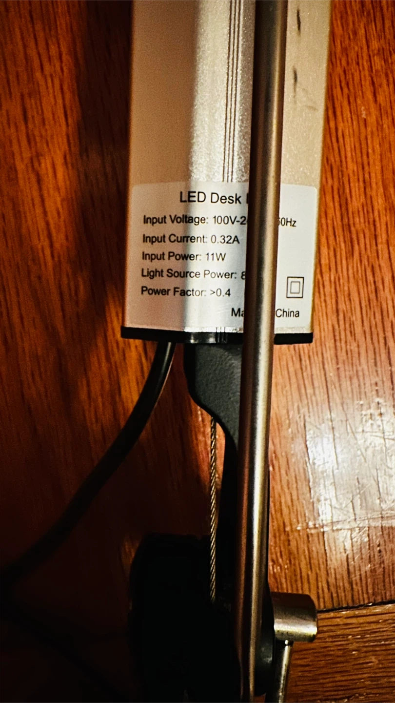 This is an Amico LED desk lamp with a clamp mount. It features a slim, modern design and provides adjustable lighting. Input voltage is 100V-240V, with 11W input power and 8.6W light source power. It's great for task lighting at a desk or workbench!
