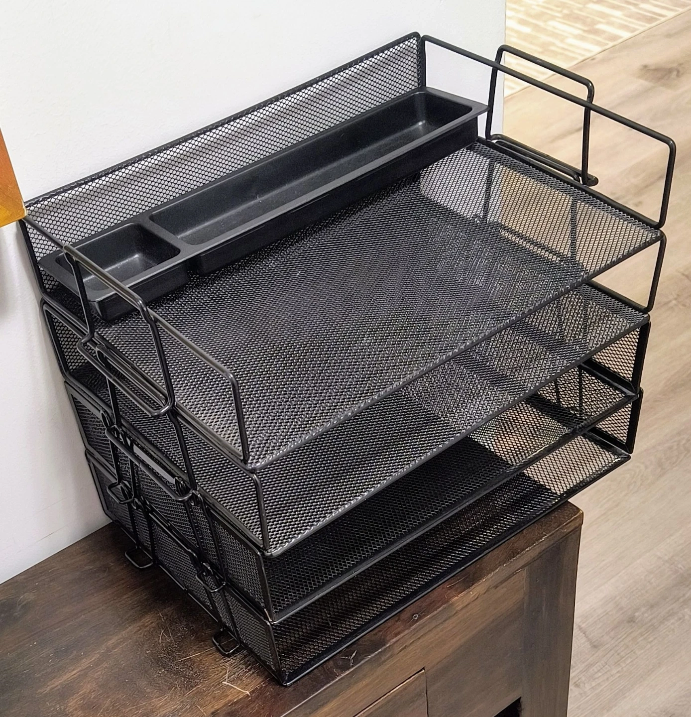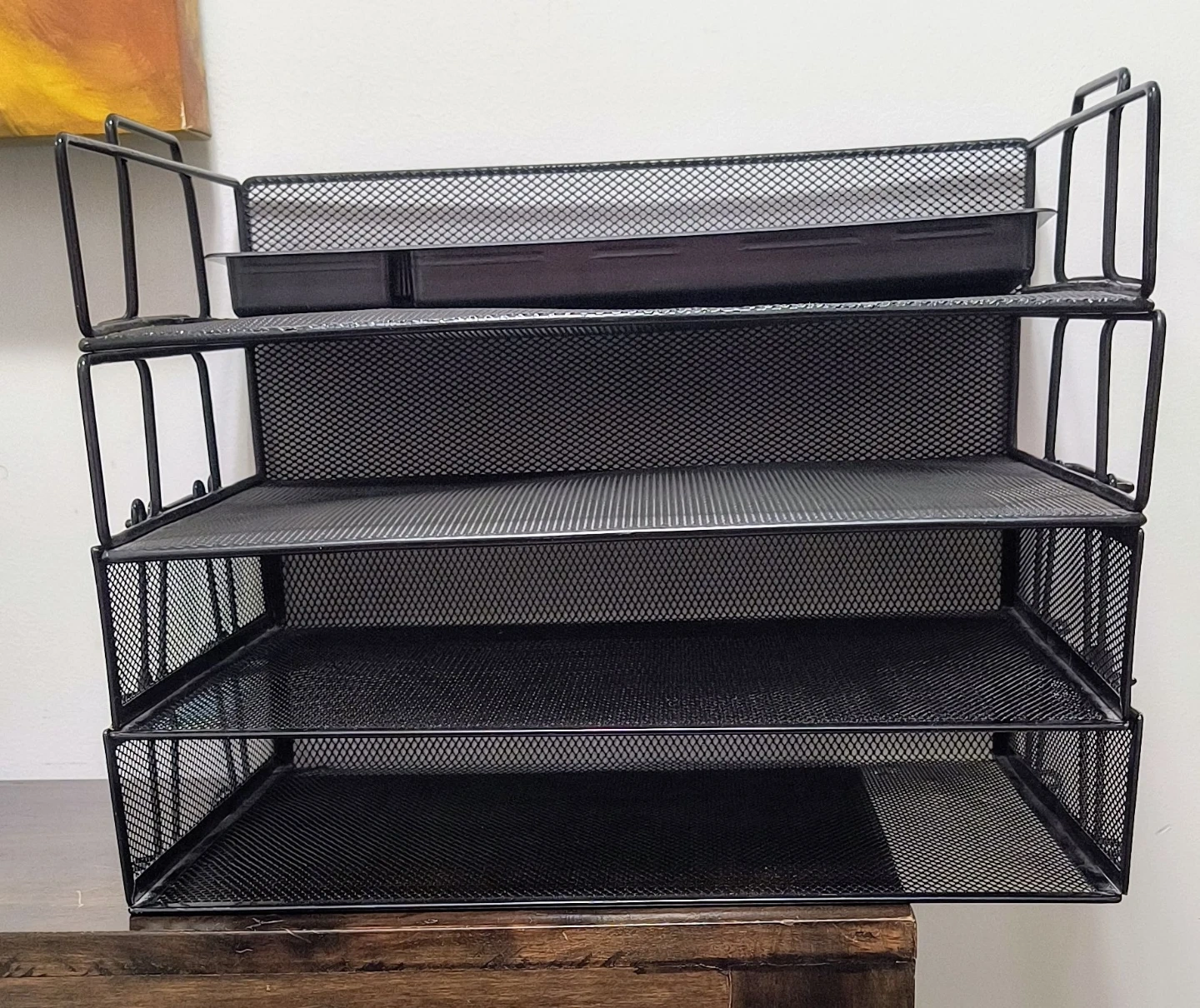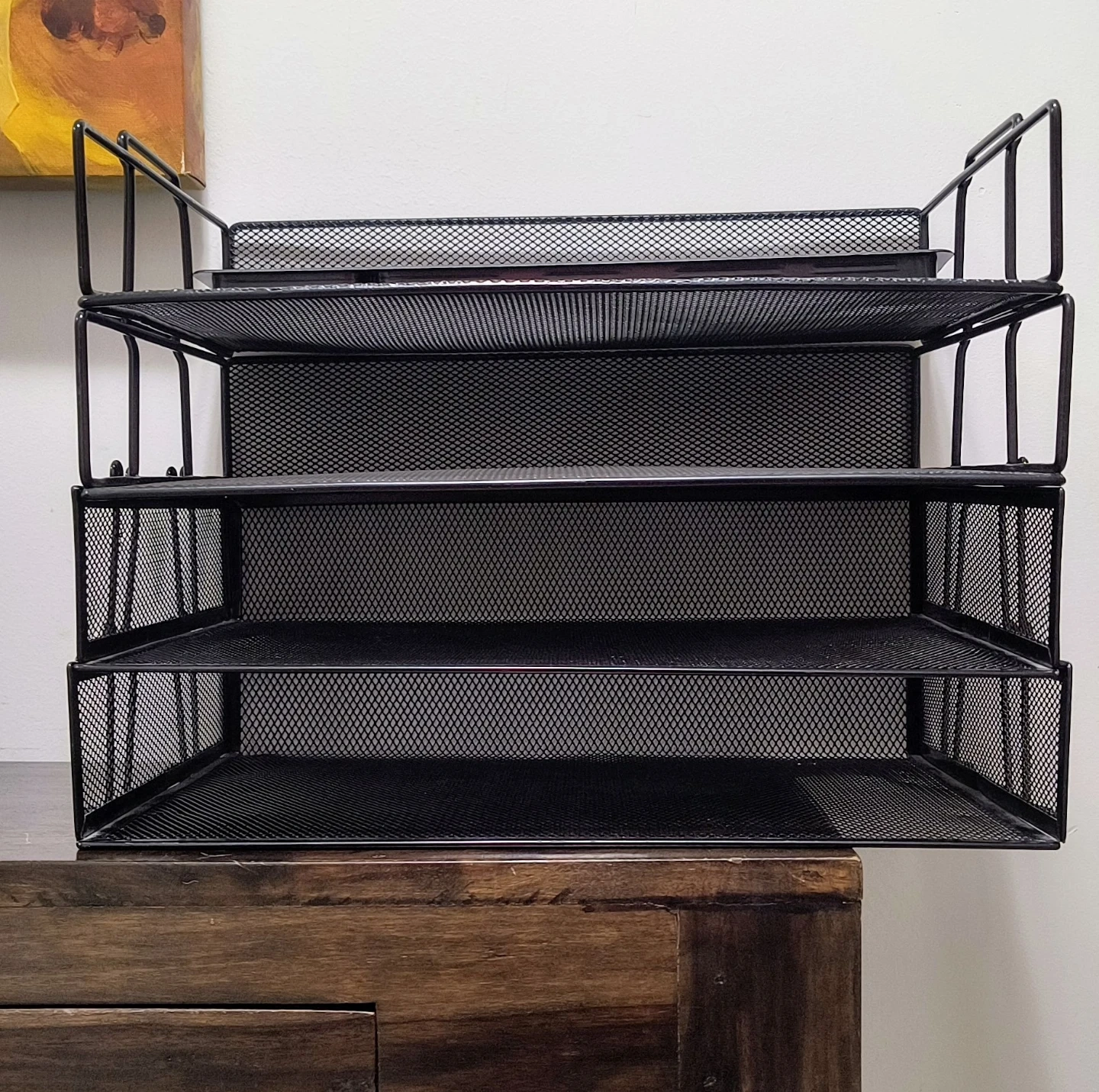 This black mesh desk organizer has four sliding trays for ample storage. It's made of durable metal mesh and includes a small top compartment for pens or clips. This organizer helps keep your workspace tidy!