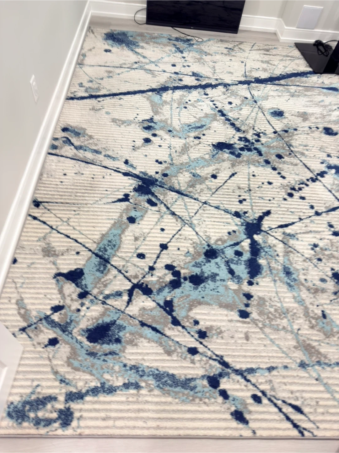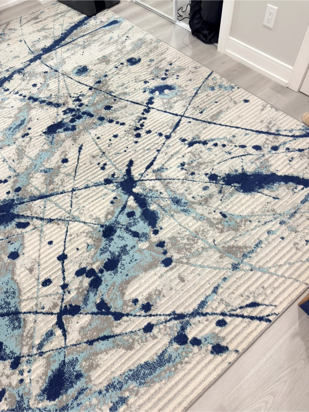 A modern area rug featuring a splatter paint design. It has a textured weave with blue, grey, and white tones. This rug is suitable for living rooms or bedrooms. Pet and smoke free and no kink.