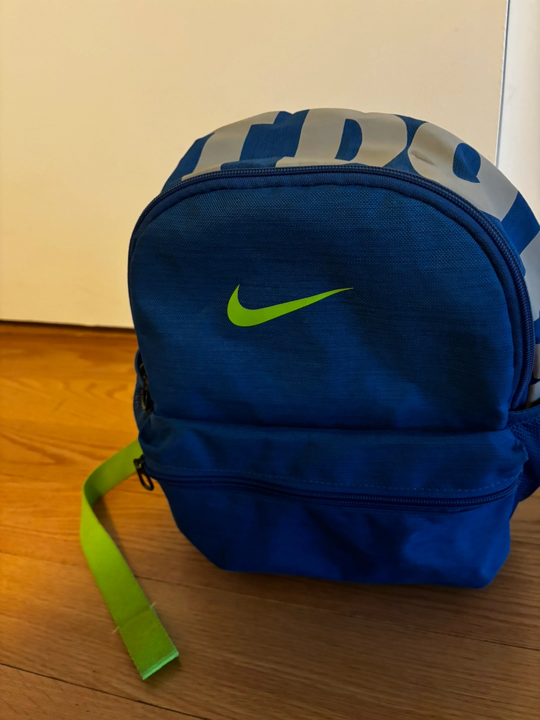 Blue and green Nike backpack with a mesh side pocket and a large zippered pocket. My son has outgrown it, but it’s in great condition.