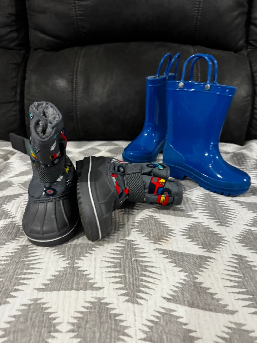 I have a pair of snow boots and rain boots available. The snow boots are gray with a truck pattern and the rain boots are blue. They are in good condition and ready for a new home! Size 5c.