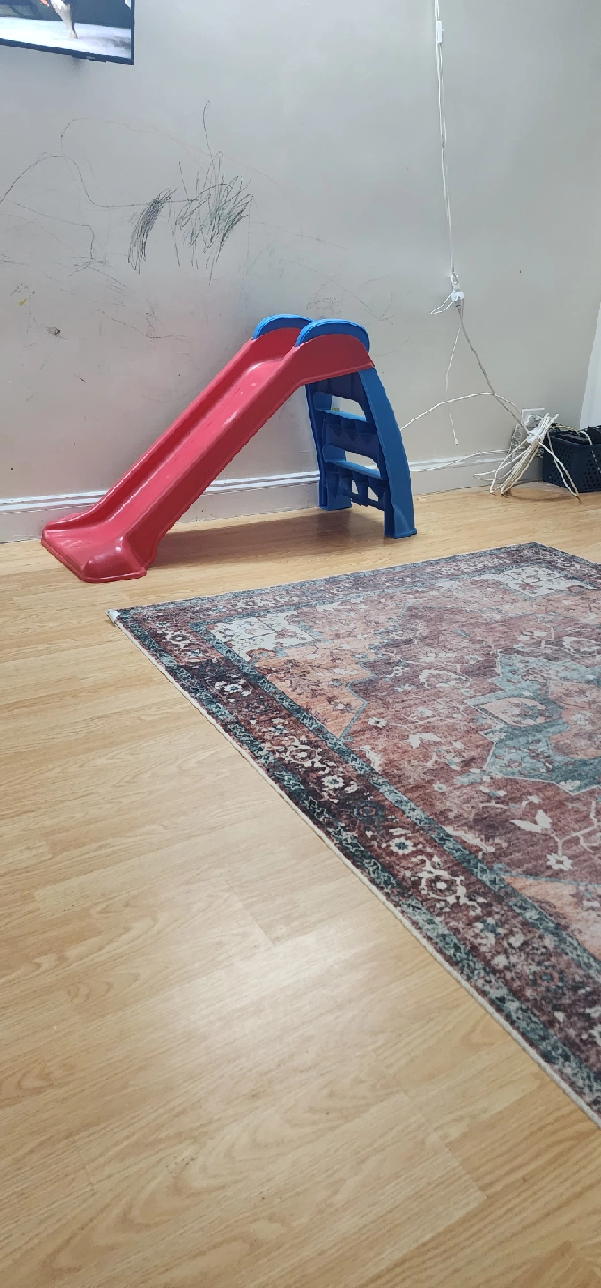 Selling a gently used kids slide with a red sliding surface and blue steps and frame. It's perfect for indoor or outdoor play!