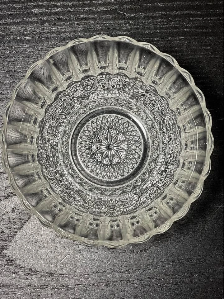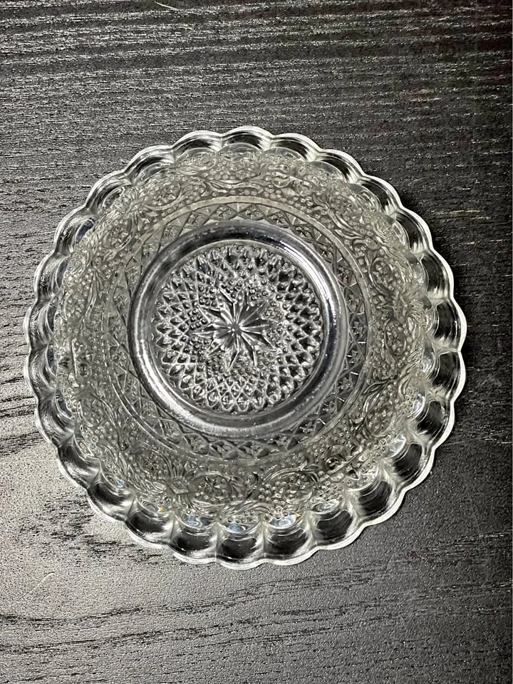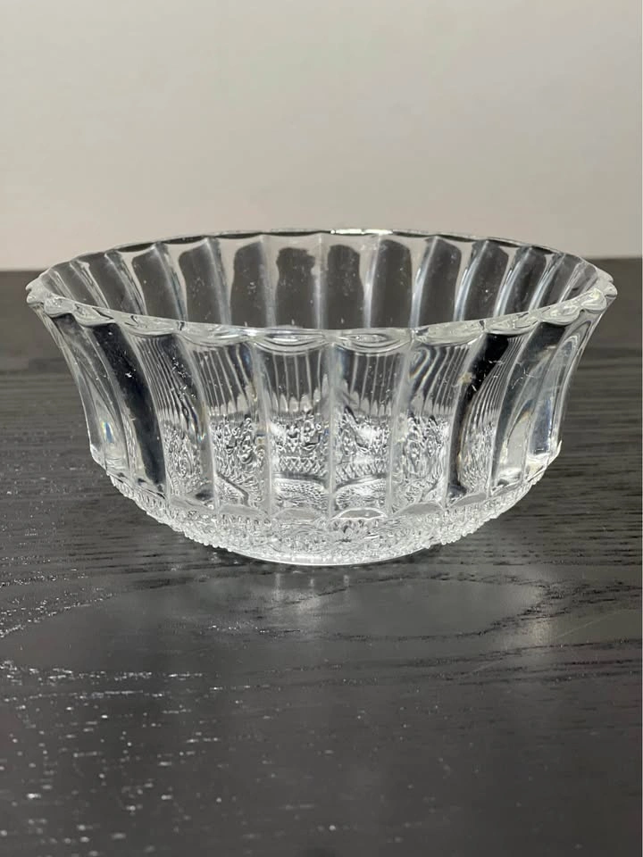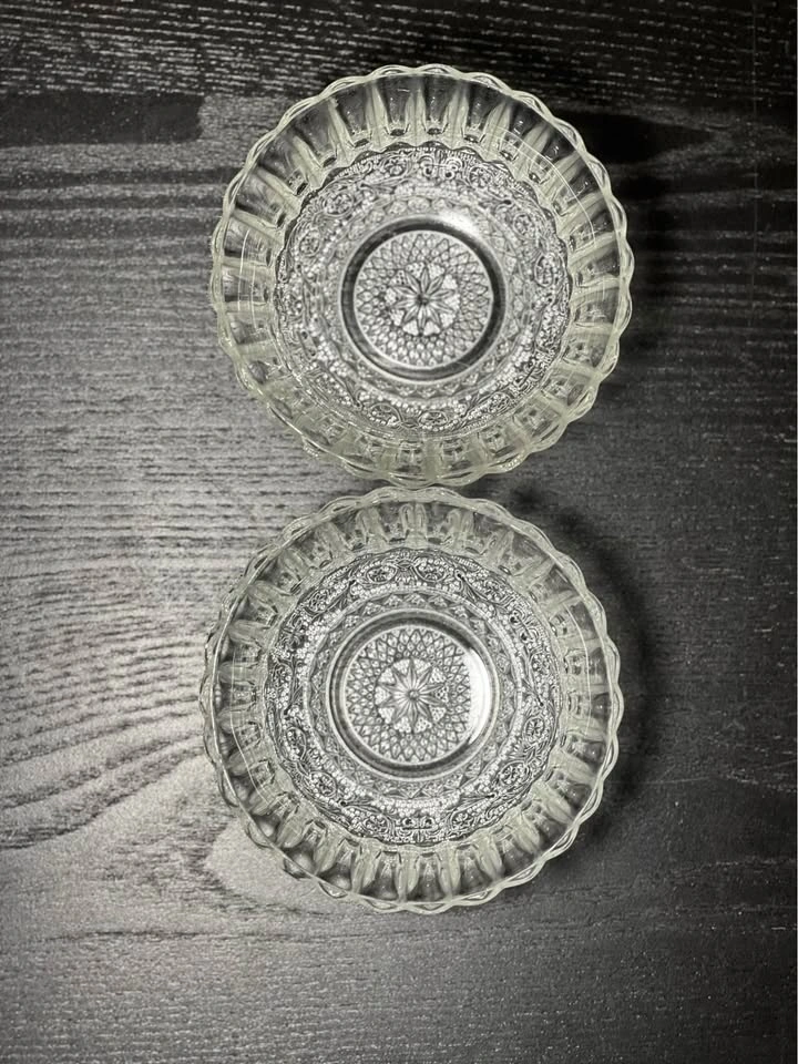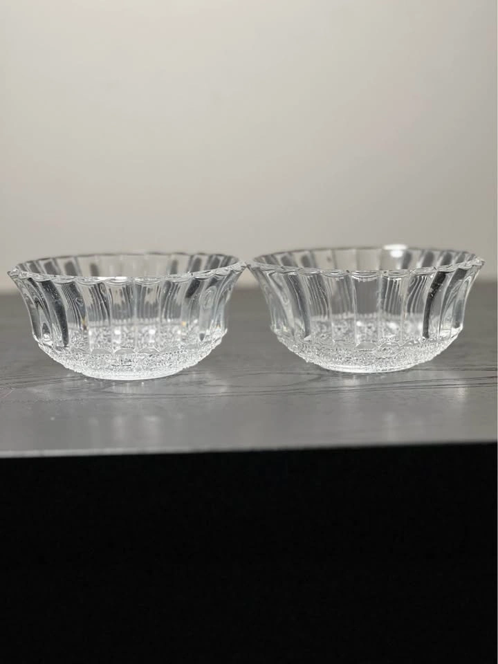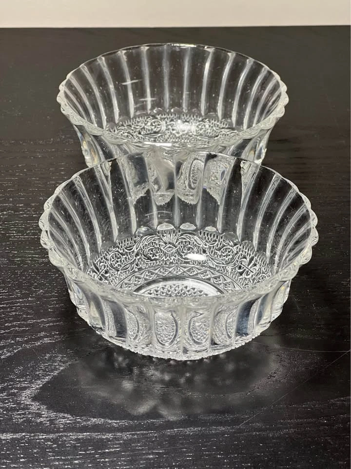 131This is a set of 2 KIG Indonesia Trellis Fleur de Lis pressed glass dessert bowls. Design: These are clear, pressed glass bowls featuring a "Fleur de Lis" pattern (also known as the "Trellis" pattern) in the center and a ribbed or fluted border around the sides. Manufacturer: The bowls were crafted by KIG (Kedaung Industrial Group) in Indonesia. Dimensions: These dessert/fruit bowls are approximately 4.5 inches in diameter. Pickup is at 58th and 7th Ave in midtown Manhattan