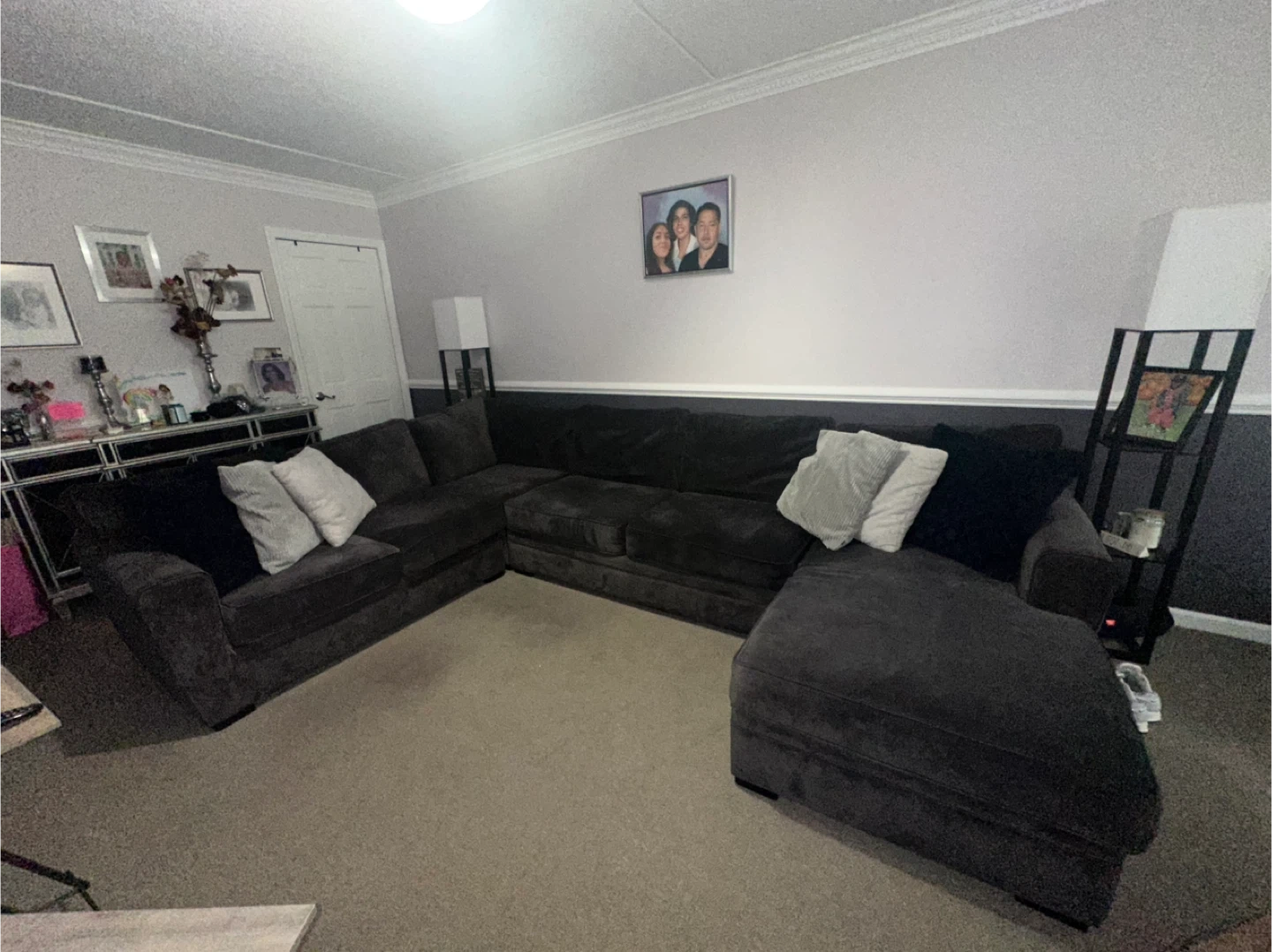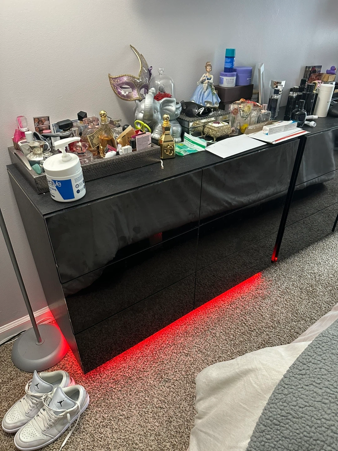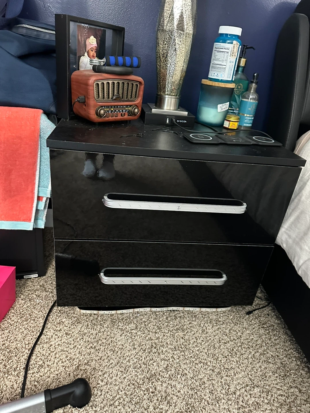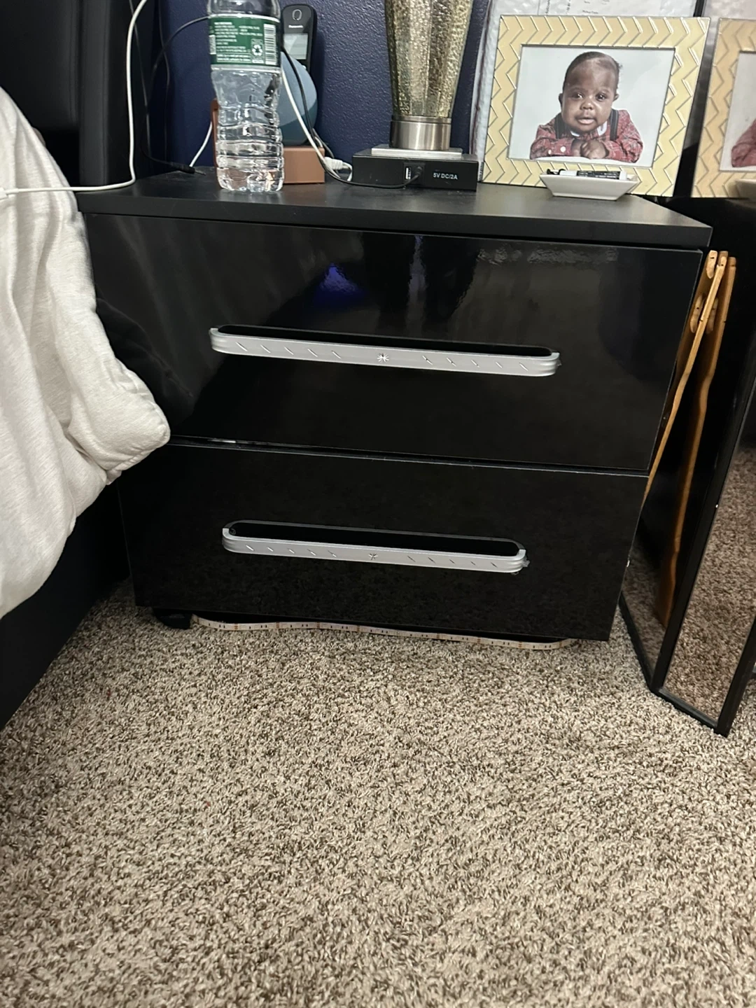 10Selling a King size black leather platform bed frame. The dimensions are approximately 94.09 x 79.53 x 33.27/34.45 inches. It has a weight capacity of 800 lbs. It's a stylish addition to any bedroom!