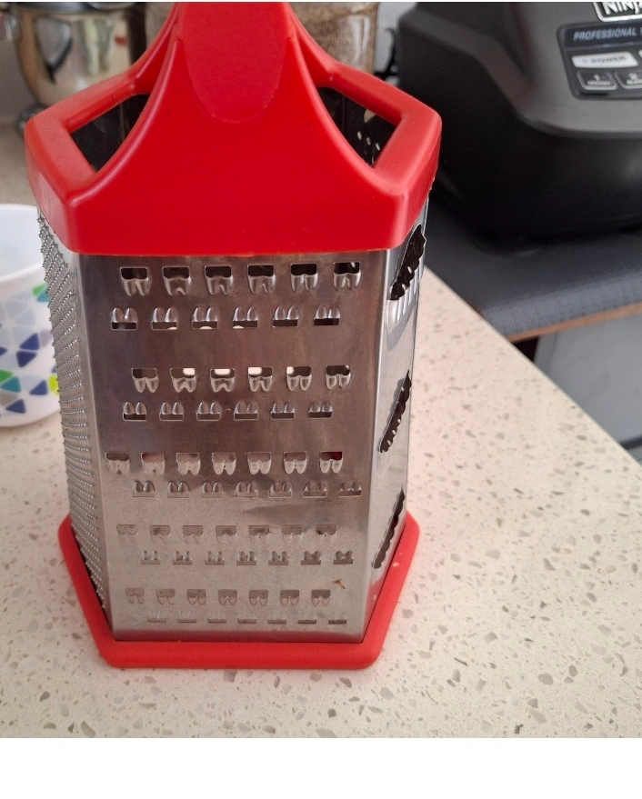 36A collection of kitchen items including a red grater, a glass dome, a Krups 3 Mix 2000 mixer, a pink and clear pitcher, and a Rajat 7x4 tiffin