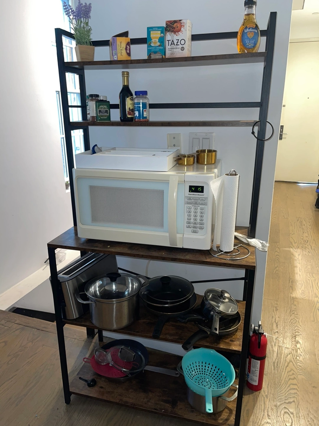 22I'm selling a kitchen rack that comes with a microwave, pots, and pans. It's perfect for organizing your kitchen and keeping everything within easy reach. The rack has multiple shelves, providing ample storage space. It includes a microwave, various pots, pans, and other kitchen essentials. Great for small spaces or anyone looking to upgrade their kitchen organization!