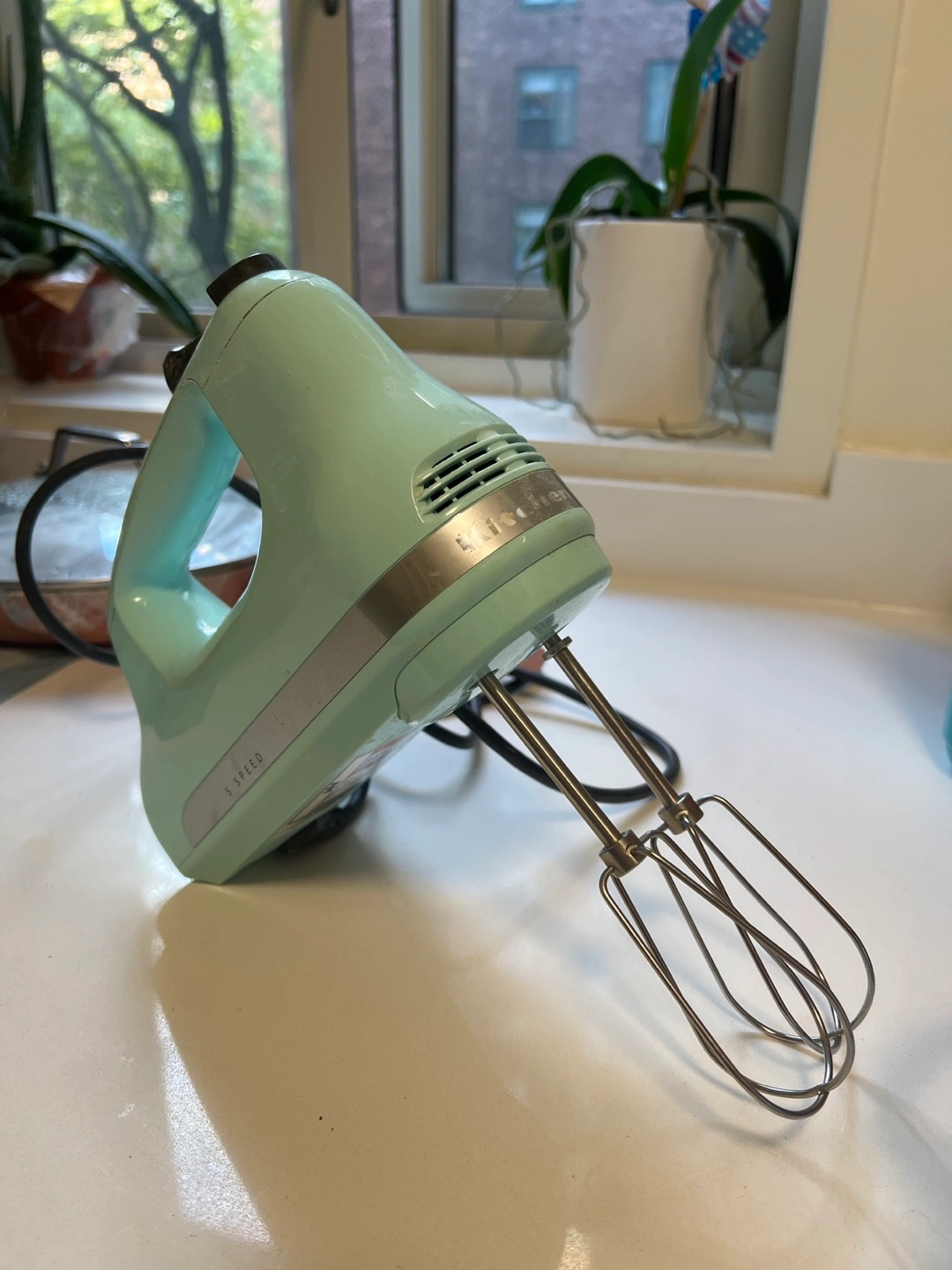 Selling a KitchenAid 5-Speed Hand Mixer in a lovely Aqua Sky color! It's perfect for all your baking needs. This mixer is in great condition and ready to help you whip up delicious treats. It features 5 speeds to handle any recipe with ease.