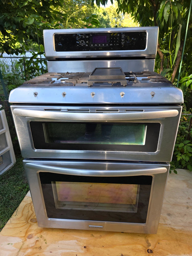 Description: Selling a KitchenAid Stainless Steel Double Oven Gas Range โ Convection + Removable Griddle โ $650 Lower oven: Convection Upper oven: Standard 5 burners + removable small griddle plate Condition: Used, in good working order Note: Two knobs and one burner cap are missing โ reflected in the price. Parts are easy to replace. ๐ Local pickup only โ buyer must bring help and proper equipment to haul away. ๐ฒ Price: $650 Perfect for the home Chef who wants a reliable double oven at a great value.