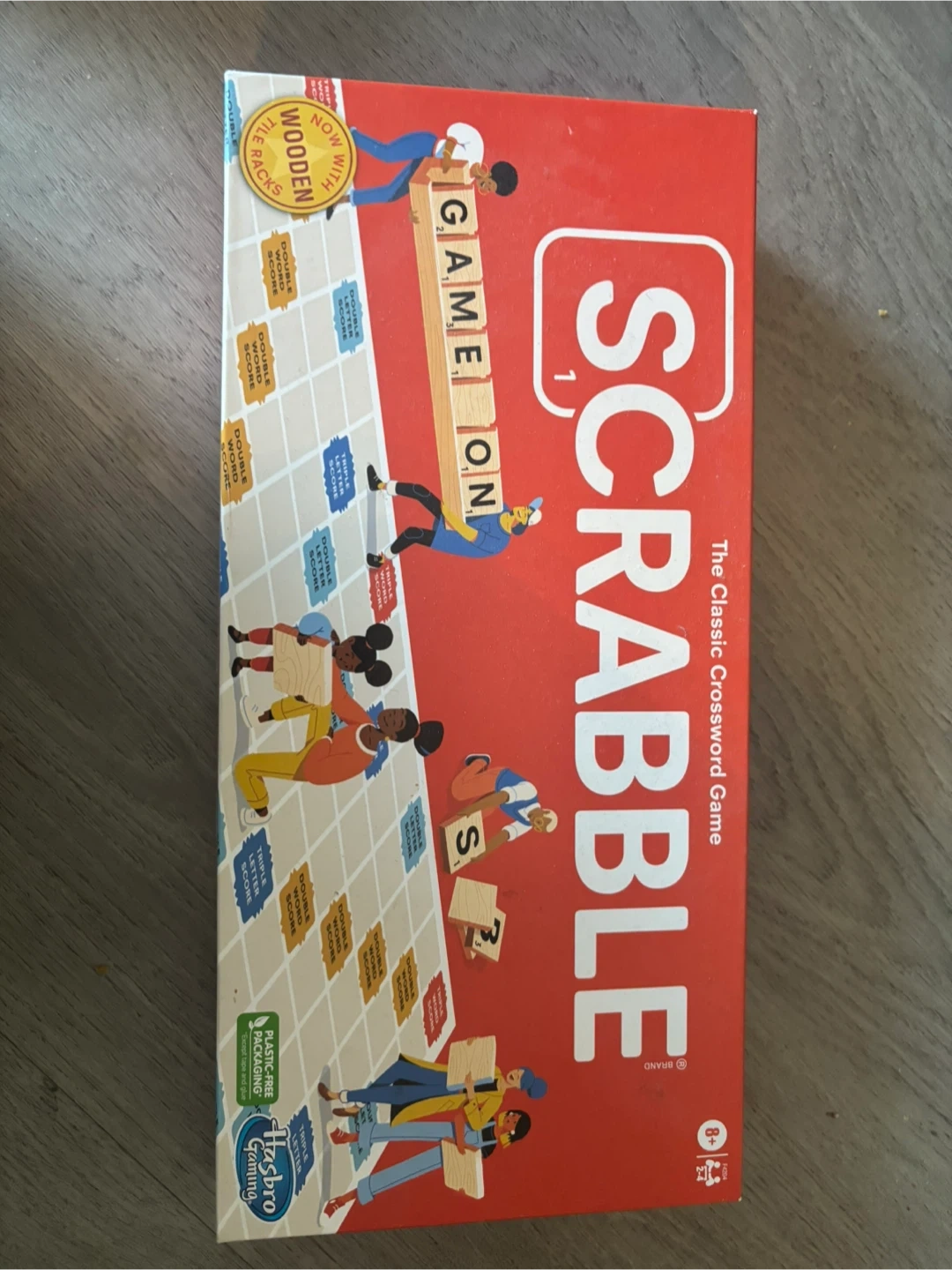This is the classic Scrabble crossword board game. It comes with wooden tile racks. The packaging is plastic-free, except for tape and glue. Recommended for ages 8+.