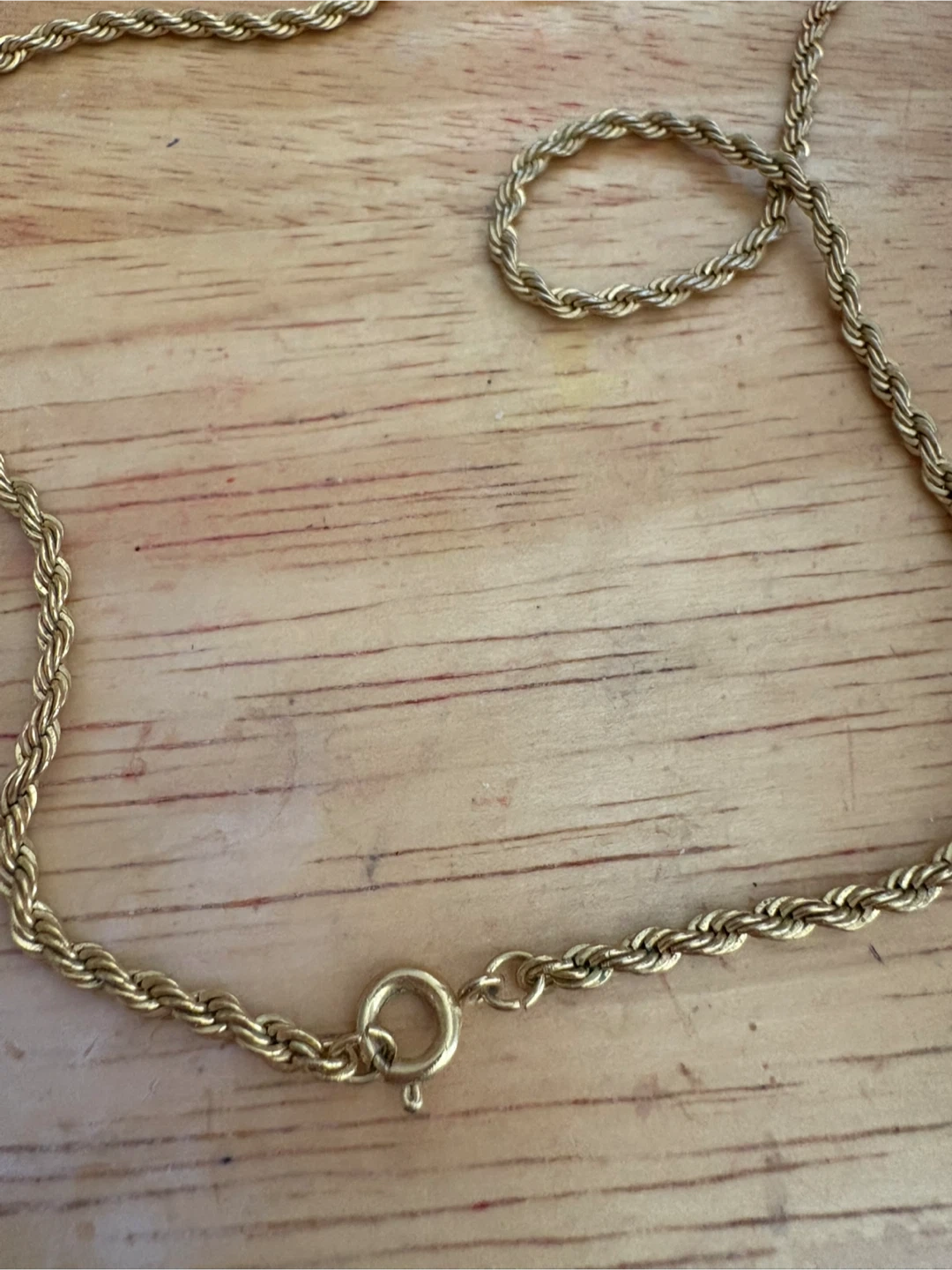 Classic gold rope chain necklace with a spring ring clasp. Appears to be made of gold or gold-plated metal. A timeless accessory for everyday wear or layering. 24 inches long.