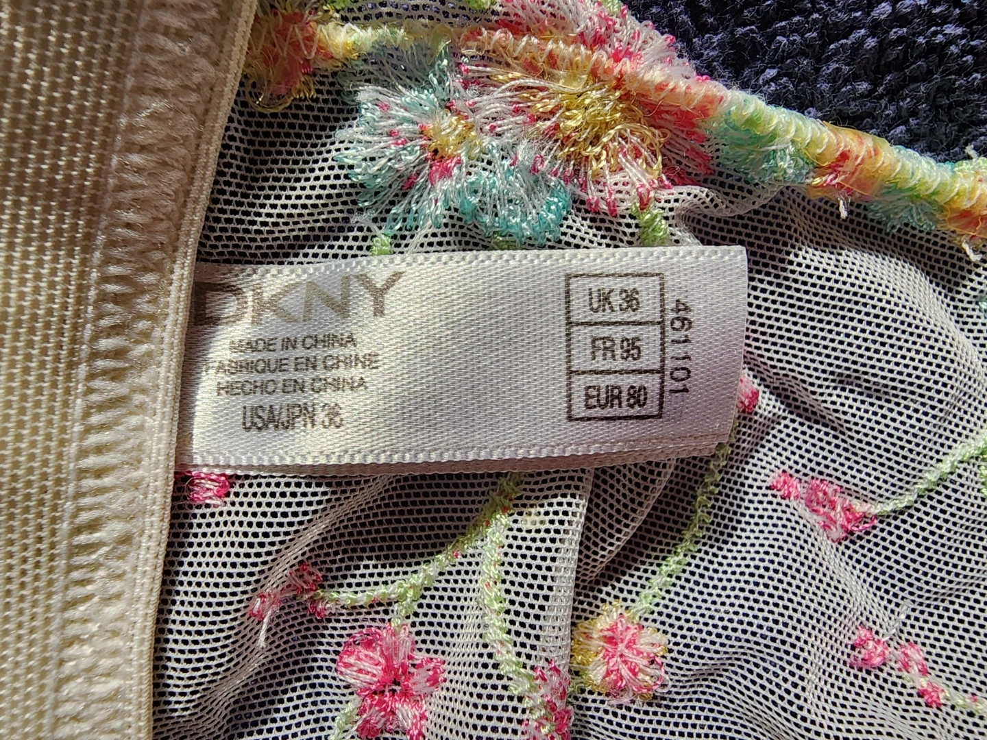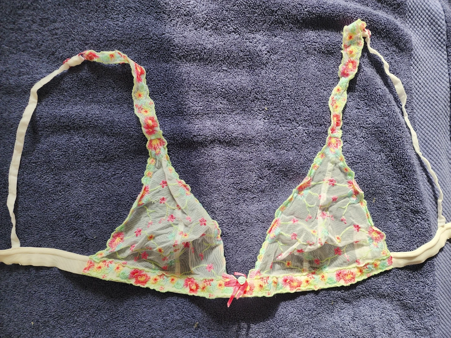 This is a DKNY embroidered mesh bralette. It features a delicate floral pattern with colorful embroidered flowers. The bralette has adjustable straps and is made of sheer mesh fabric.