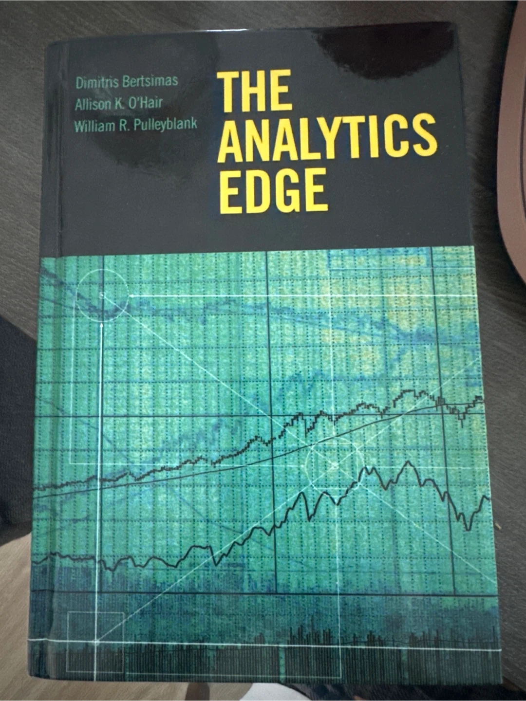 This is the book 'The Analytics Edge' by Dimitris Bertsimas, Allison K. O'Hair, and William R. Pulleynk. It covers topics related to analytics. Its cover features a graph with analytical data. This book is for students or professionals studying analytics.