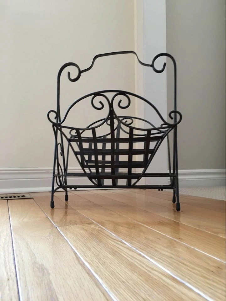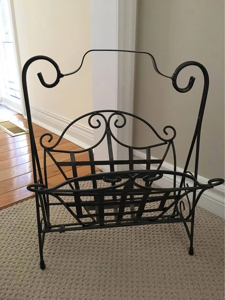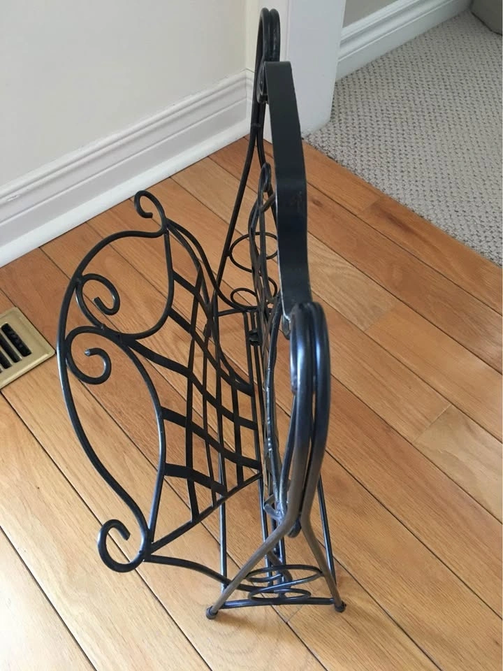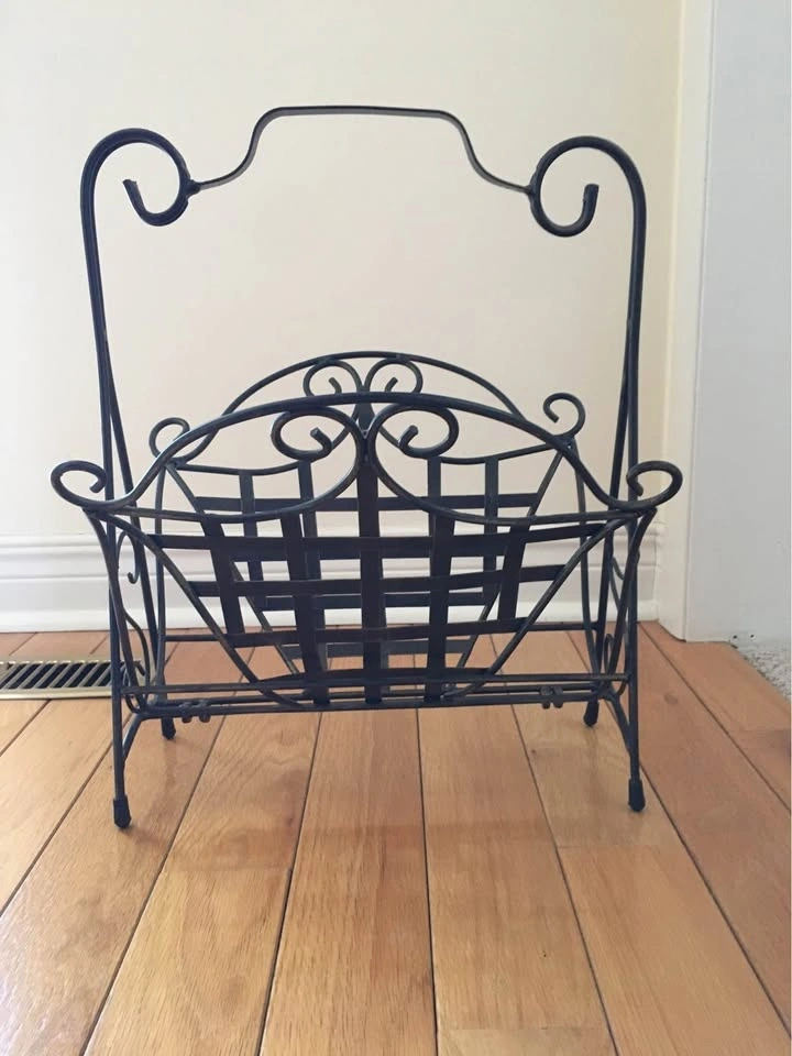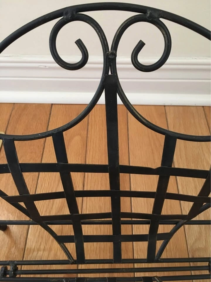 Brand new black wrought iron expandable holder with two compartments. Elegant and sturdy with its ornate design, this scrolled wrought iron top handle holder has plenty of room to hold all your favourite items. Constructed of a black wrought iron base and it is expandable with choice of one or two holding sections. Folding design makes it easy to move or store. This pretty multi-purpose holder can be used for storing cutting boards, placemats, towels, garden tools, magazines, books or files. Measures 18 inches high, 13 inches deep when two compartments are fully extended and 14.5 inches wide. Smoke and pet free home. Please see detailed photos. Pick up Warden and Highway 7 area in Markham. Cash only please.