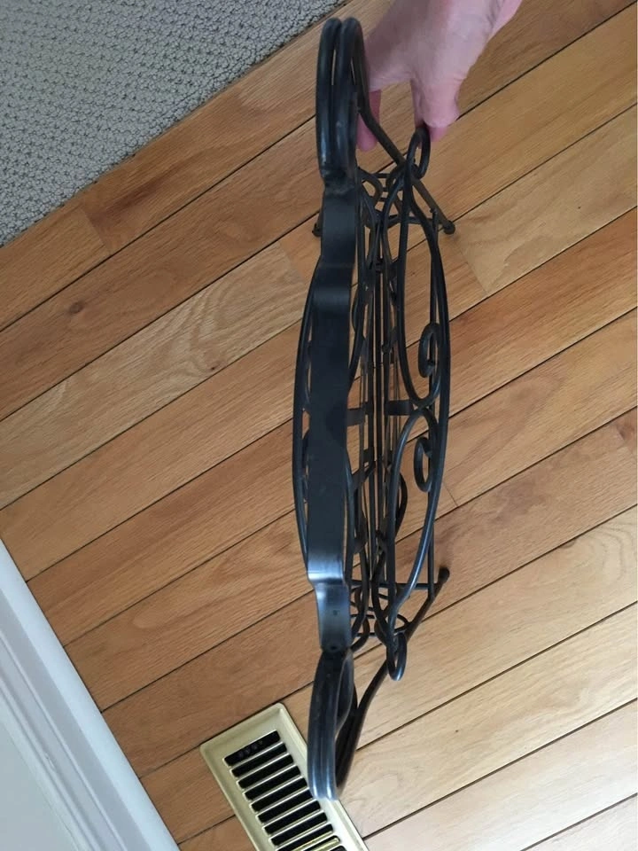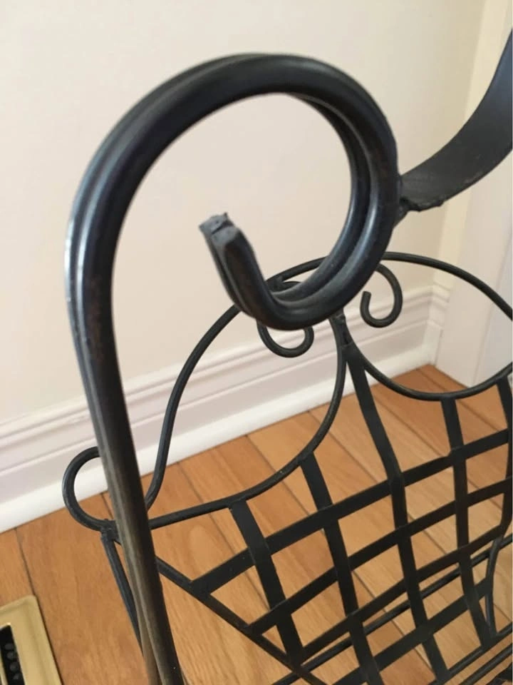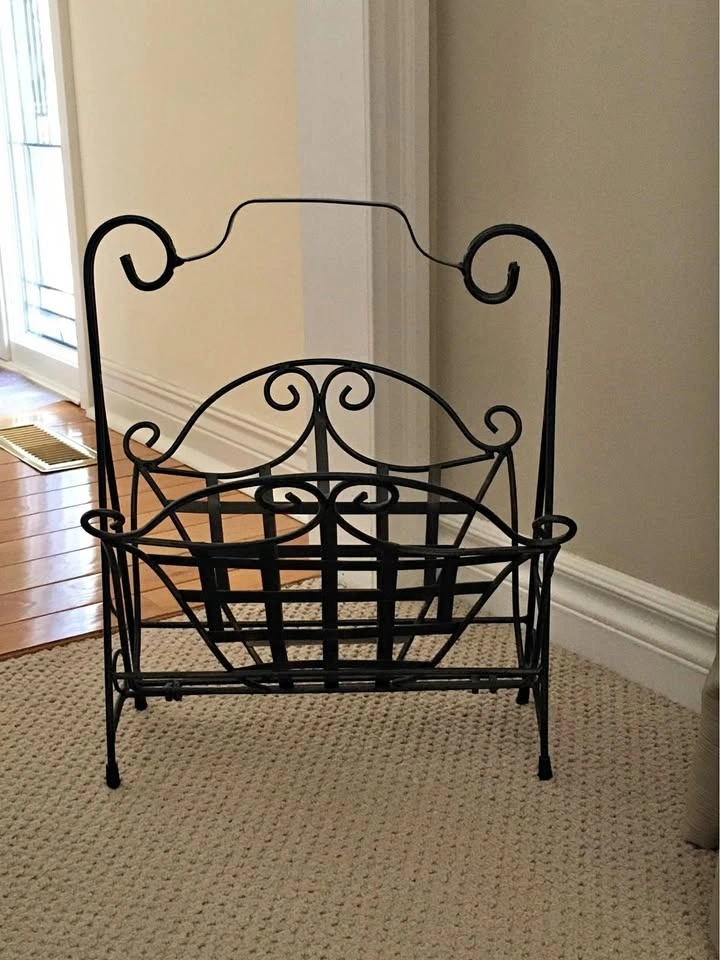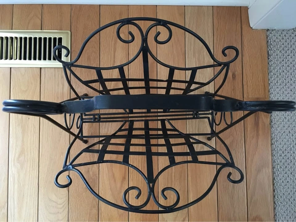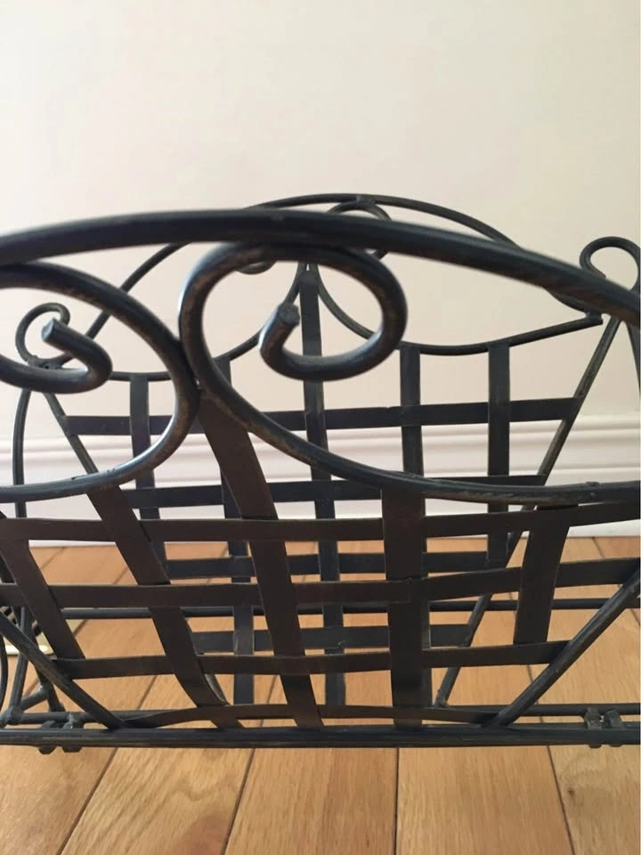 Brand new black wrought iron expandable holder with two compartments. Elegant and sturdy with its ornate design, this scrolled wrought iron top handle holder has plenty of room to hold all your favourite items. Constructed of a black wrought iron base and it is expandable with choice of one or two holding sections. Folding design makes it easy to move or store. This pretty multi-purpose holder can be used for storing cutting boards, placemats, towels, garden tools, magazines, books or files. Measures 18 inches high, 13 inches deep when two compartments are fully extended and 14.5 inches wide. Smoke and pet free home. Please see detailed photos. Pick up Warden and Highway 7 area in Markham. Cash only please.