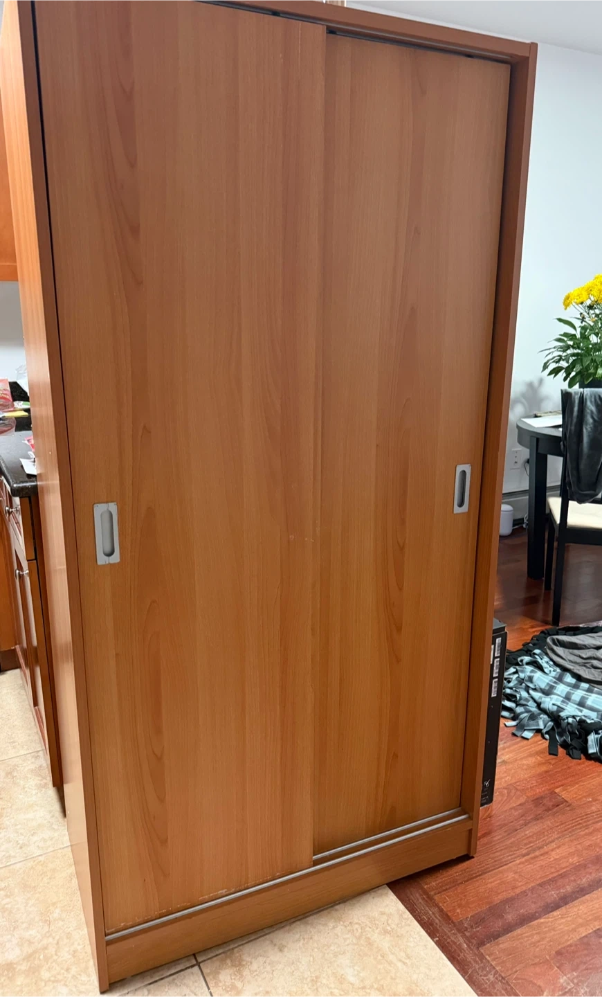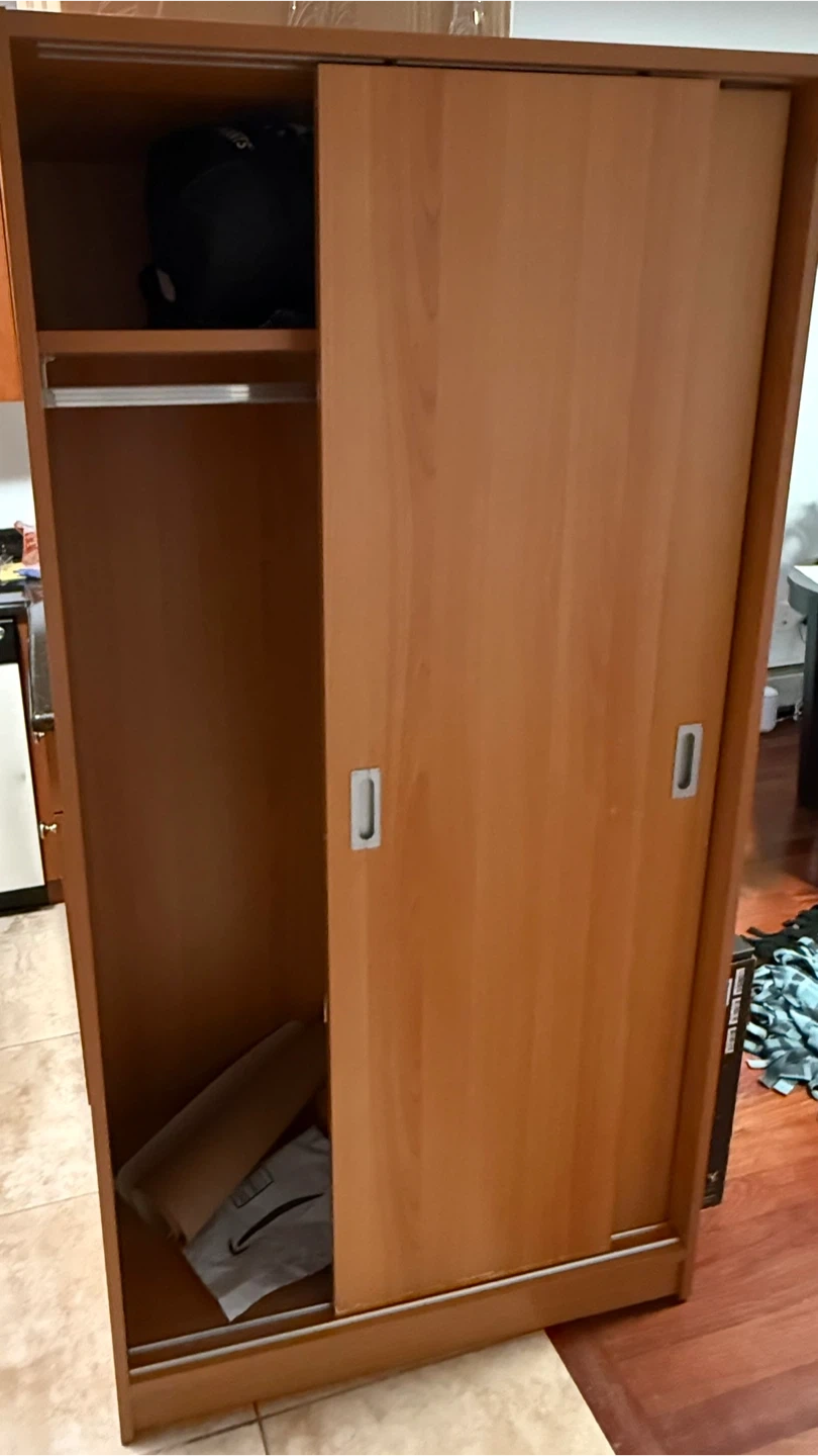 This wardrobe features a warm wood finish and smooth sliding doors. It has a hanging rod and shelf inside for storage.