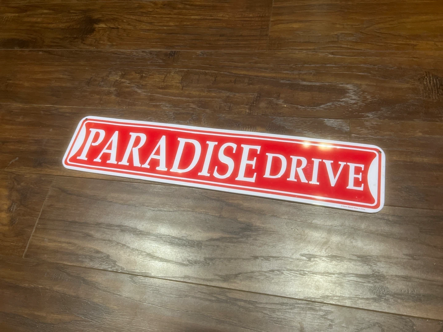 This is a Paradise Drive street sign. It's red and white. Great for decorating a garage or man cave!