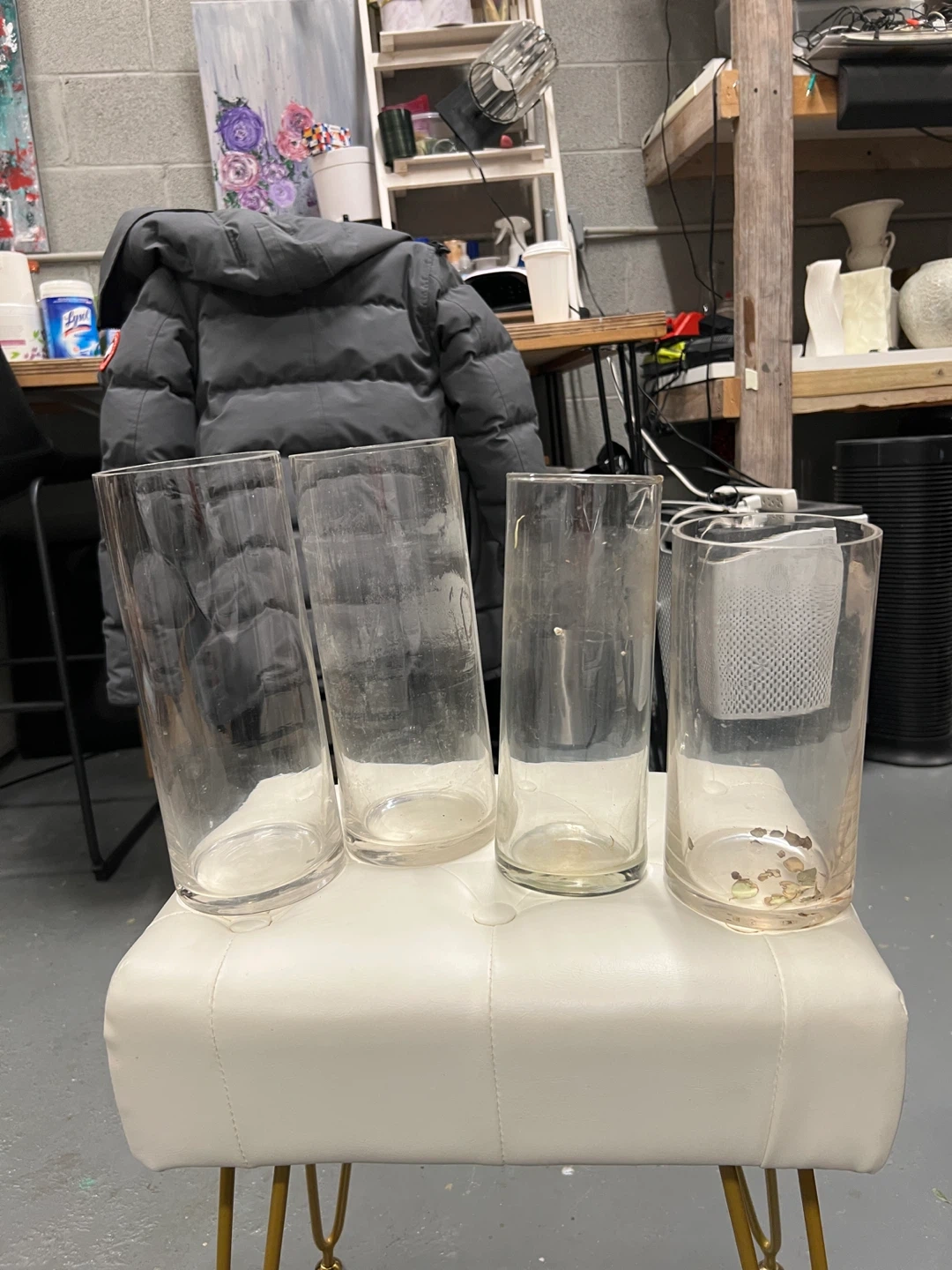 Selling a set of 4 glass cylinder vases! They're perfect for floral arrangements, centerpieces, or adding a touch of modern elegance to your home decor. They're in good condition and ready to be used for your next event or everyday display