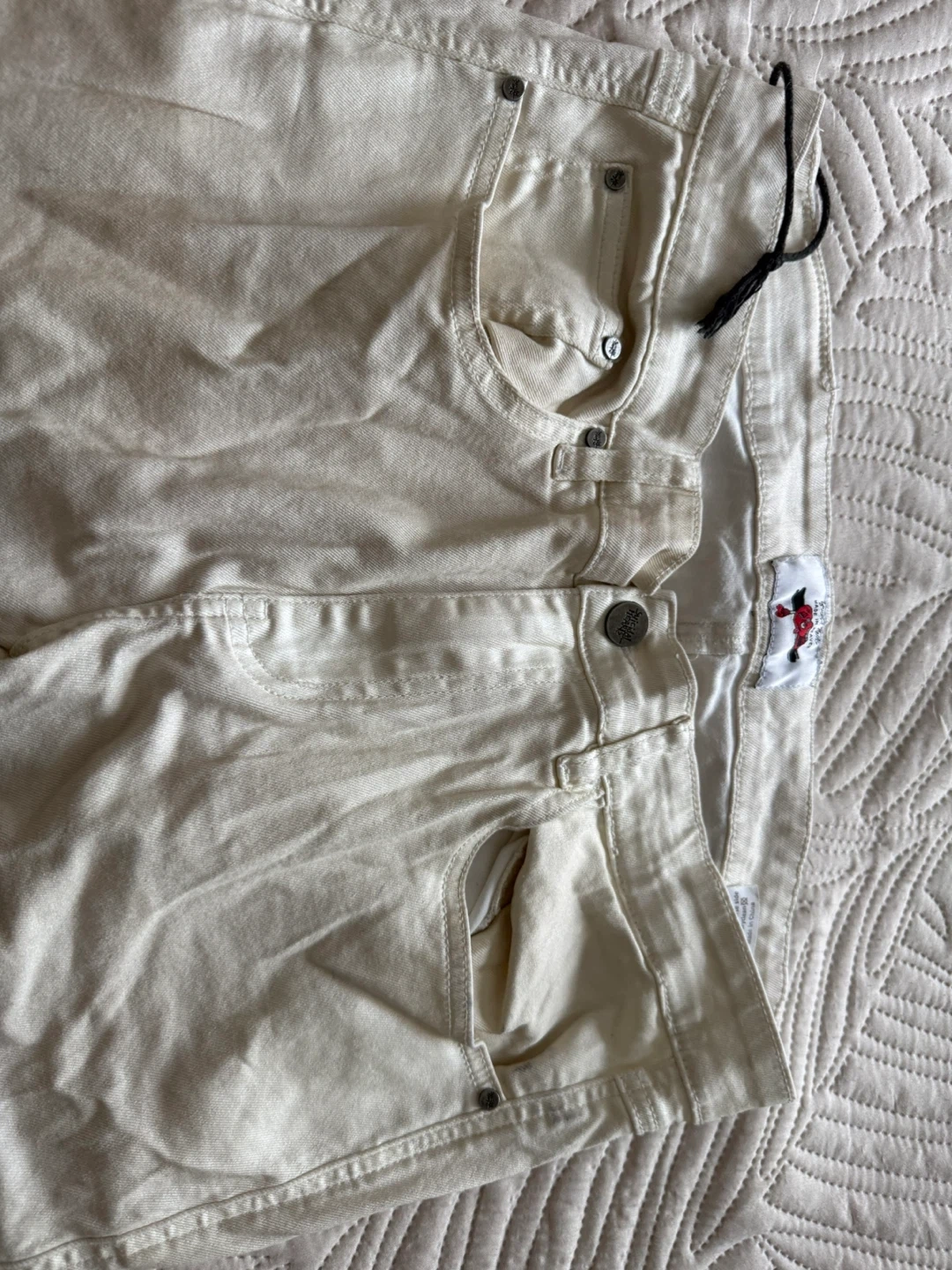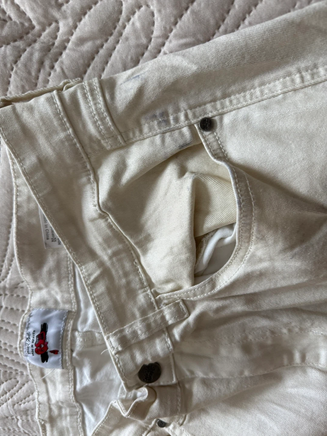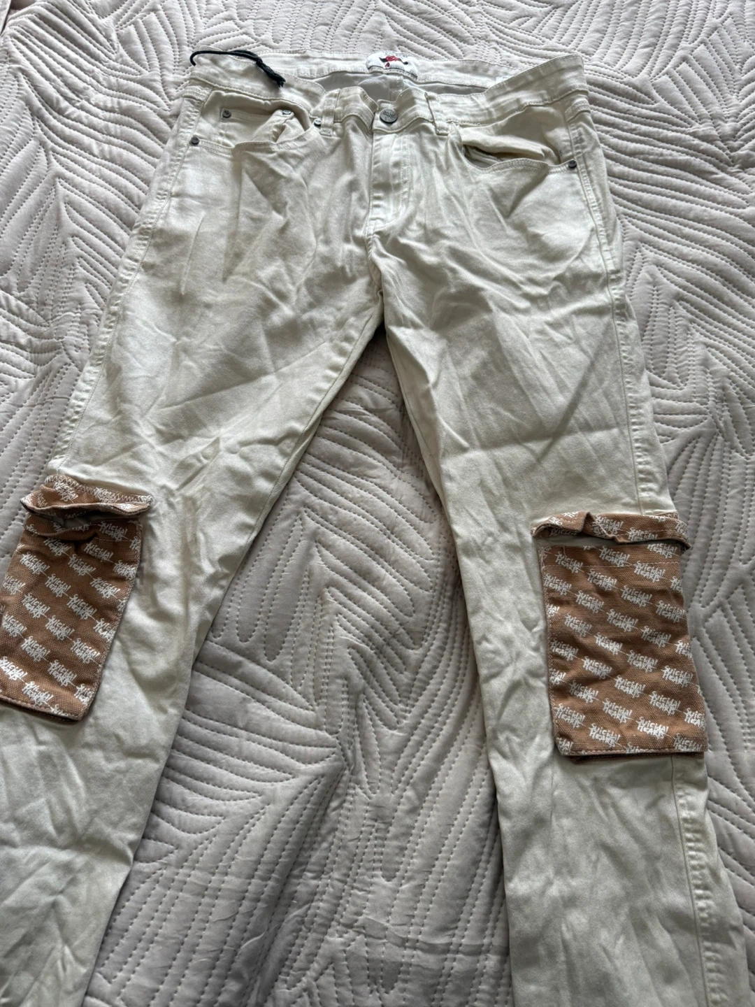 Cream cargo pants with unique pocket design. Features a comfortable fit and stylish detailing. Size is approximately 27 inches in the waist.